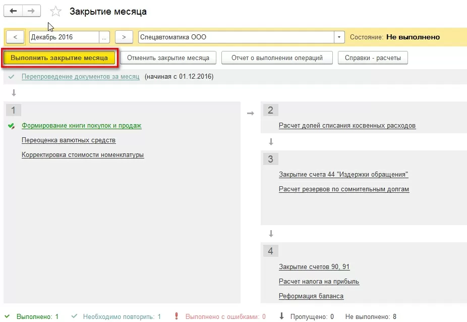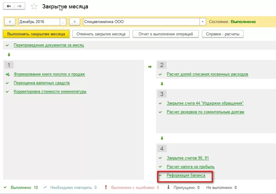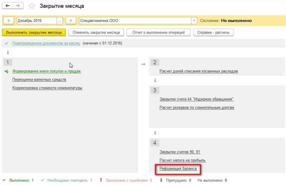 Реформация – крайняя операция в перечне операций закрытия декабря. Ее невозможно выполнить, пока осталась невыполненной хотя бы одна расположенная выше операция.