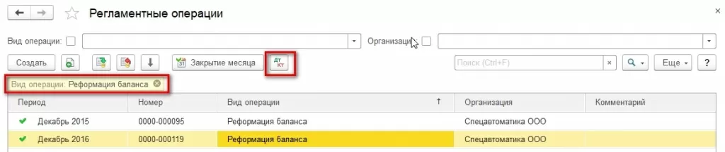 Просмотр проводок через рабочее место закрытия периода не всегда удобен. Оперативный доступ к проводкам, сформированным регламентными операциями, можно также осуществить через соответствующий раздел в меню «Операции–Регламентные операции–Реформация баланса»: