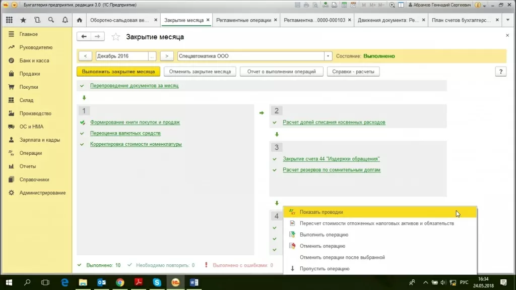 В конфигурации запустится алгоритм расчета регламентных операций в последовательности, указанной на схеме. По мере выполнения каждой регламентной операции, она будет выделяться зеленым цветом с установкой флага «Проведен»–«V».