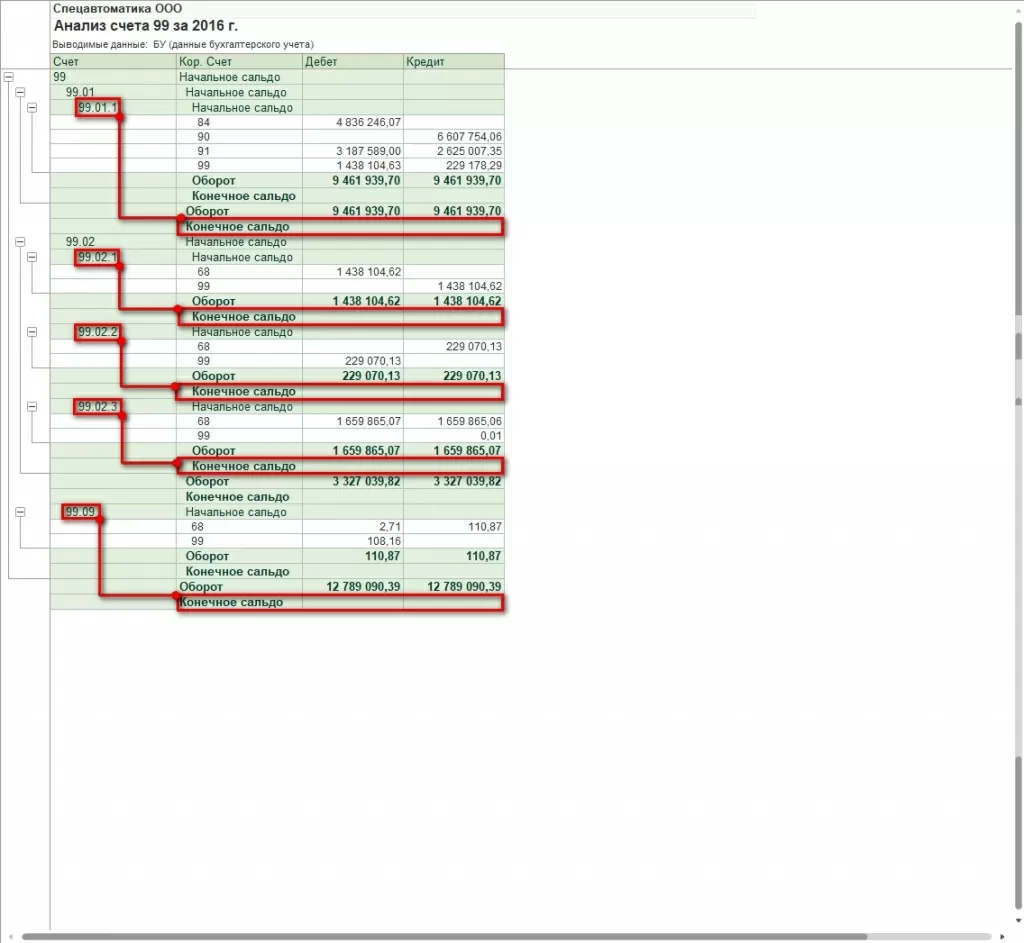 Конечное сальдо равно нулю для каждого субсчета счета 99.
