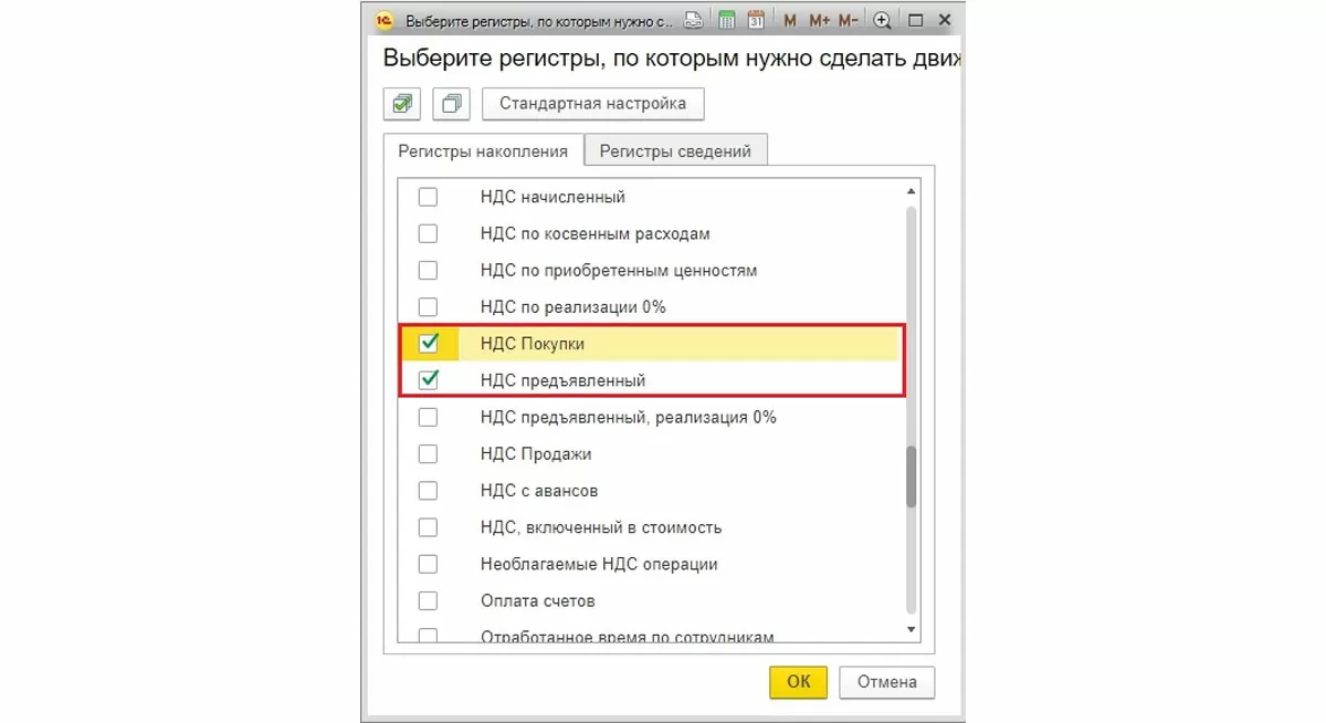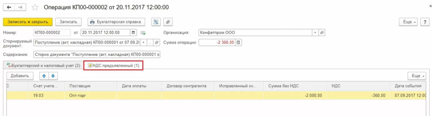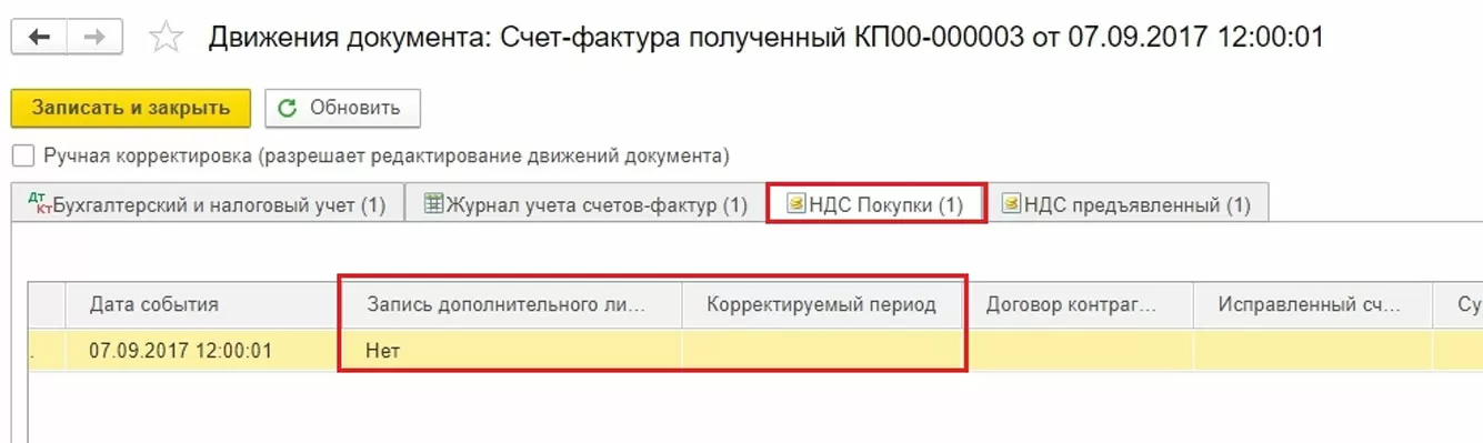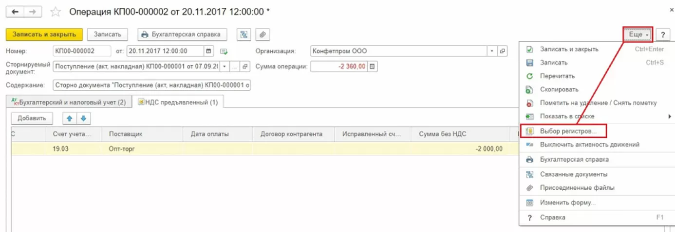 Есть несколько вариантов, как заполнить регистр НДС Покупки. Можно по кнопке Еще добавить этот регистр в документ (сторно Поступление) и заполнить вручную.