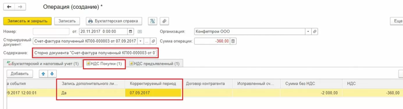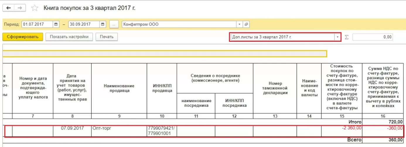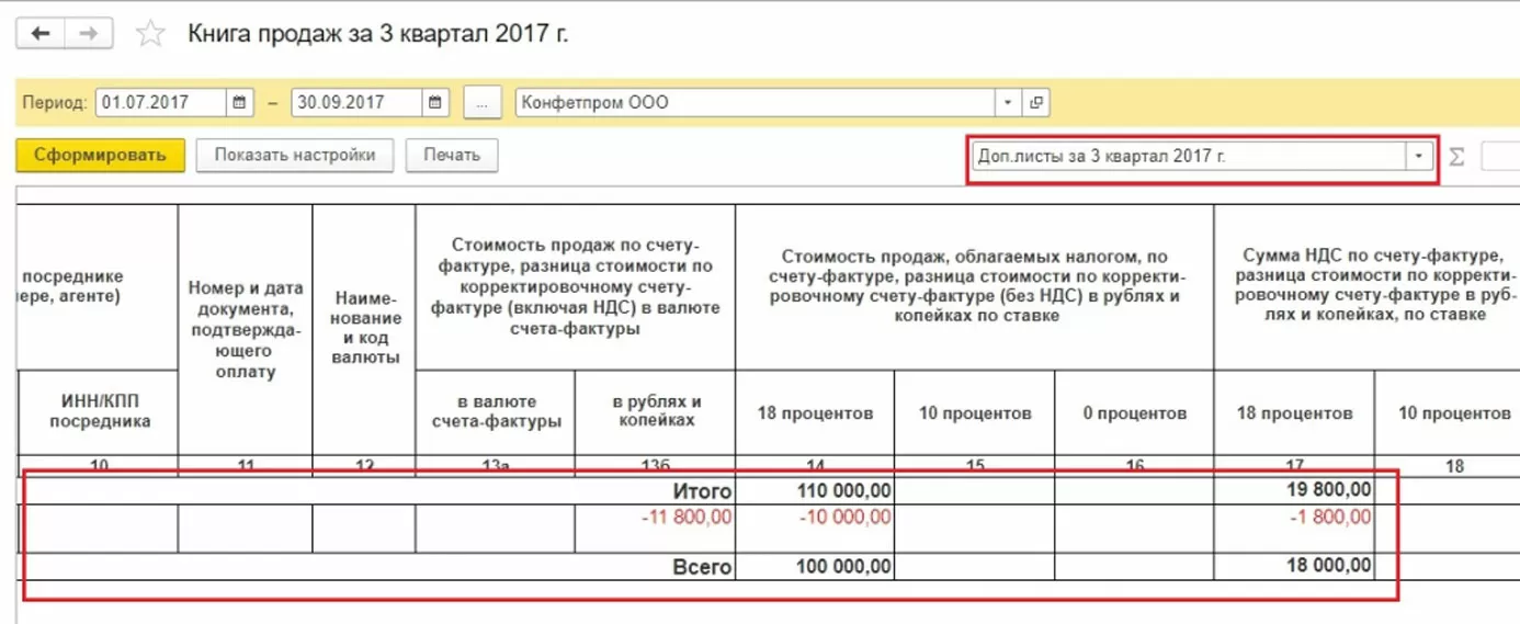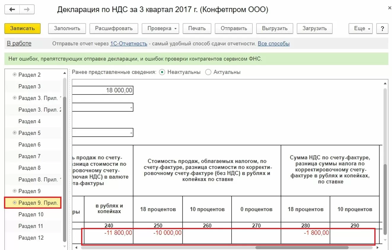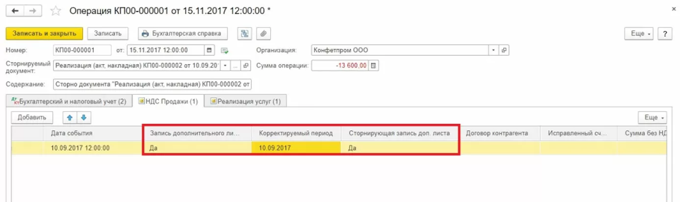 Для правильного учета НДС следует наряду со сторнированием документа в бухгалтерском учете заполнить дополнительный лист к книге продаж за 3-й квартал 2017 г. В этом доп.листе ошибочная сч.фактура будет аннулирована. Обратите внимание, сам документ по корректировке НДС будет создан в ноябре 2017 г., но в нем будет указан период корректировки – 3-й квартал 2017 г. На основании скорректированных данных можно будет заполнить уточненную декларацию по НДС, в который появится раздел 9.