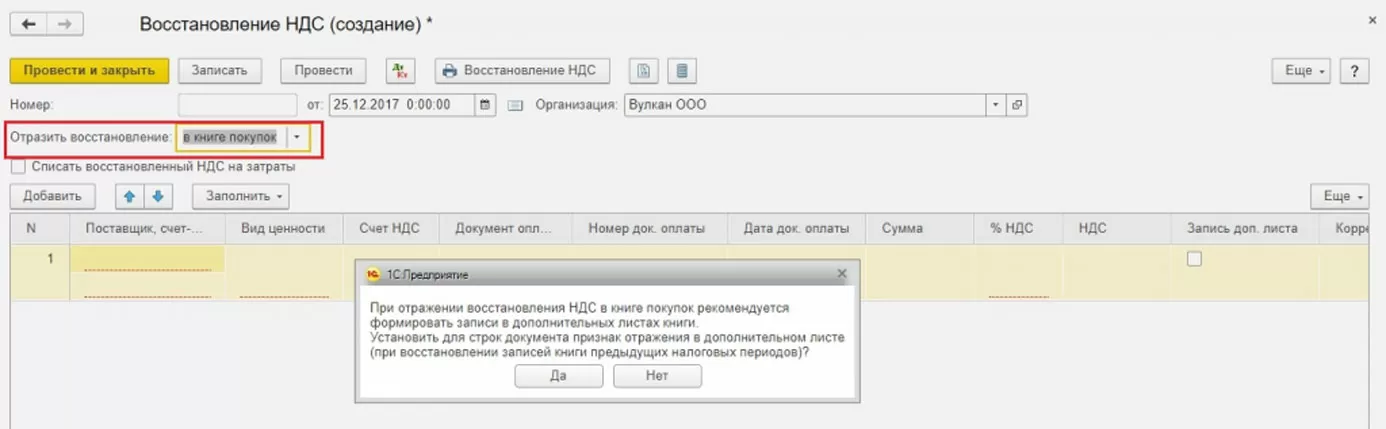 Указываем, что надо отразить восстановление в книге покупок. Появляется предупреждение, нажимаем Да.