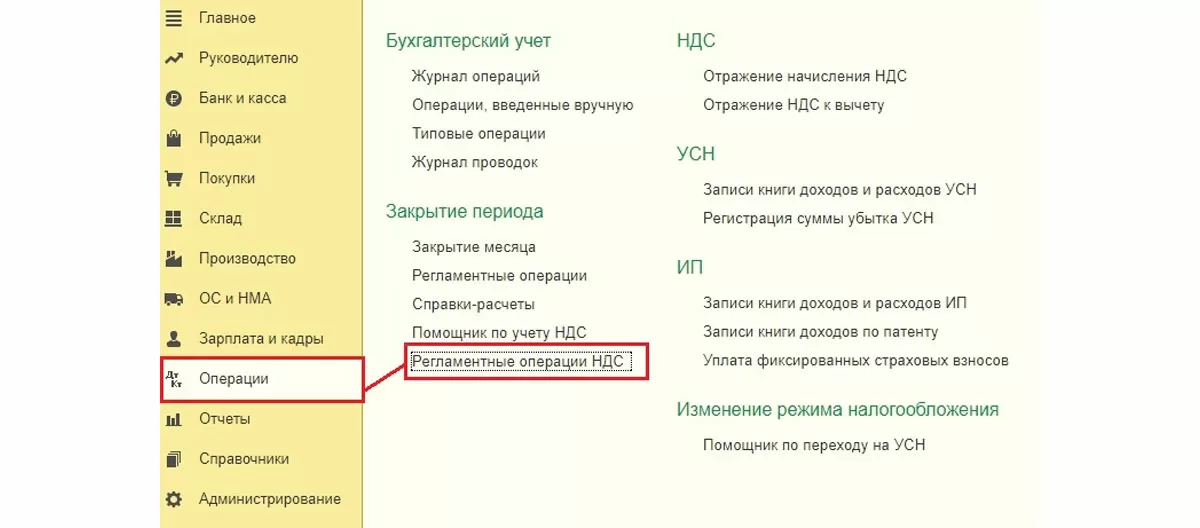 Операции => Регламентные операции НДС