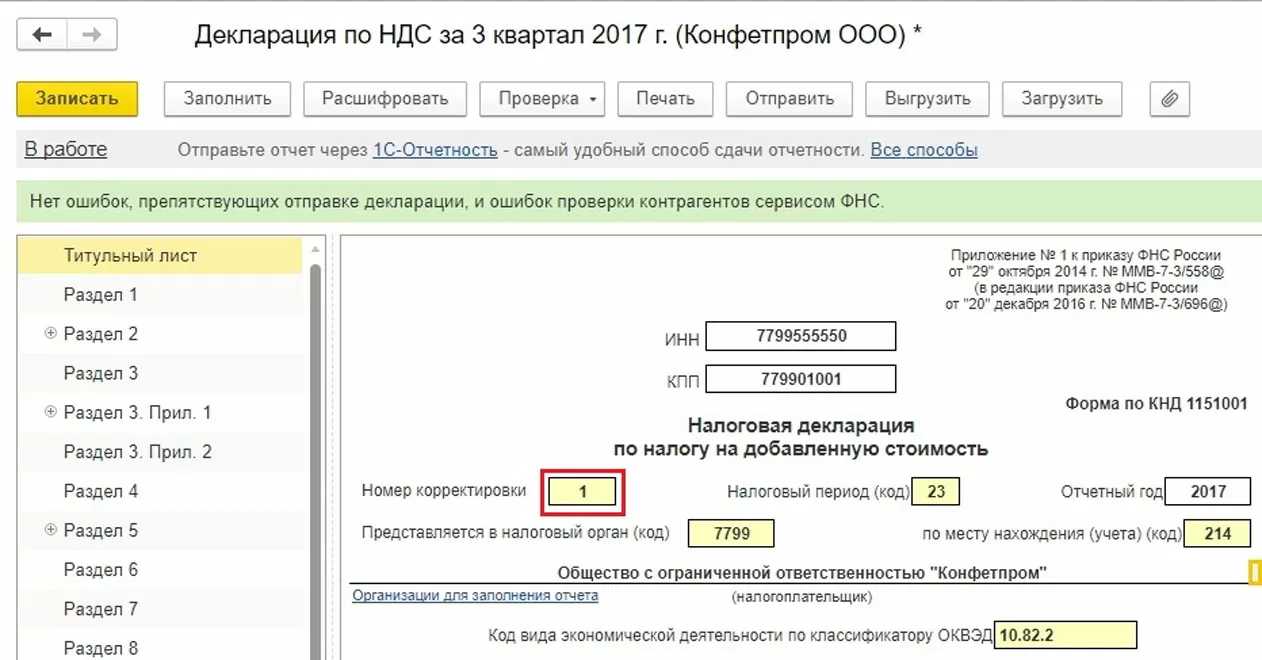 Заполняем уточненную декларацию по НДС. Обязательно указываем номер корректировки.