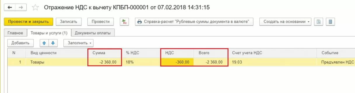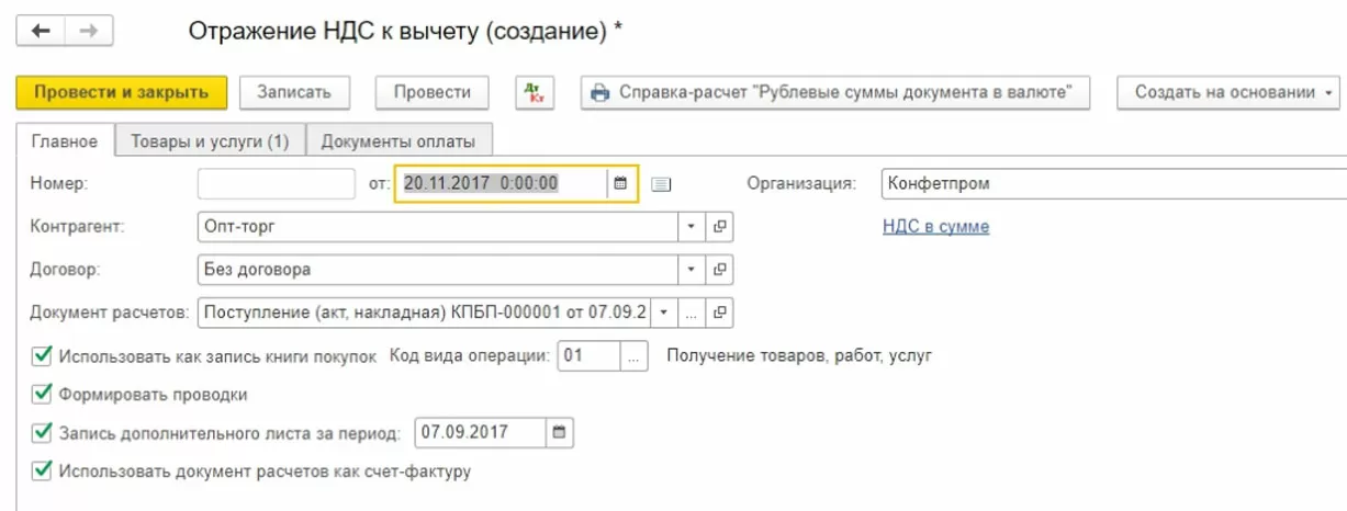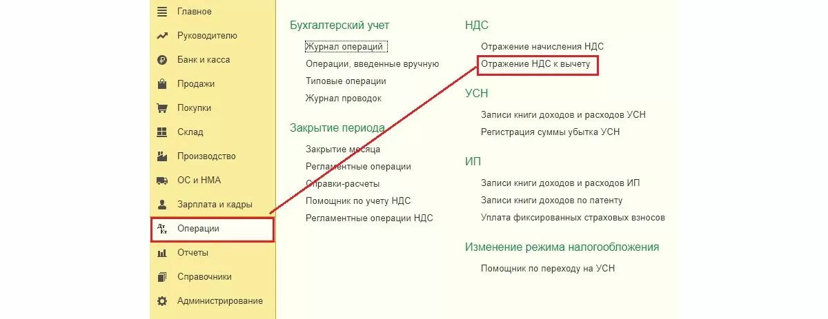 Операции => Отражение НДС к вычету