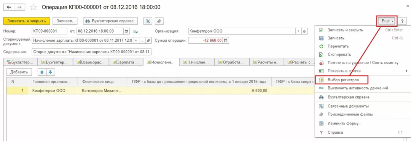 Если вдруг какой-то учетный регистр не попал автоматически в документ сторно, его можно добавить вручную. Для этого в меню кнопки Еще надо нажать Выбор регистров… и из списка выбрать соответствующий.