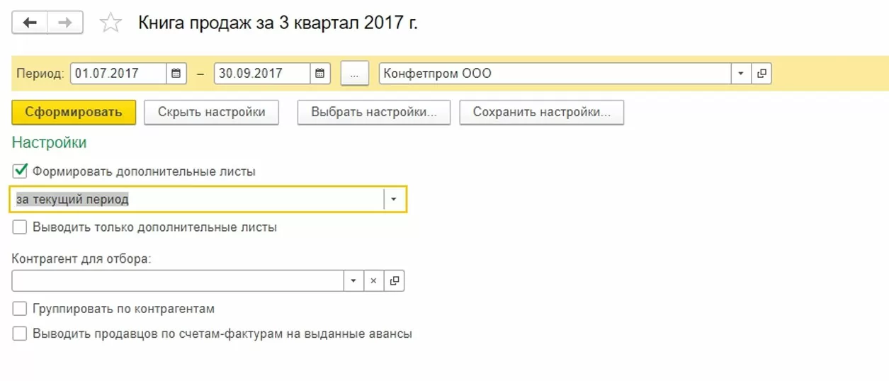 Указываем в настройках этого документа, что мы формируем доп.листы и записи книги покупок