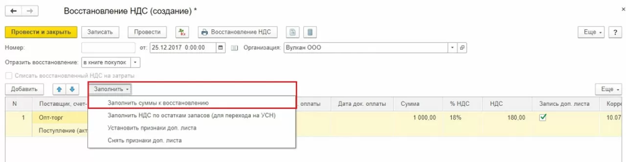 Можно заполнить данные вручную по кнопке Добавить. По кнопке Заполнить выбрать вариант Заполнить суммы к восстановлению. В данном случае суммы на отрицательные значения менять не надо.