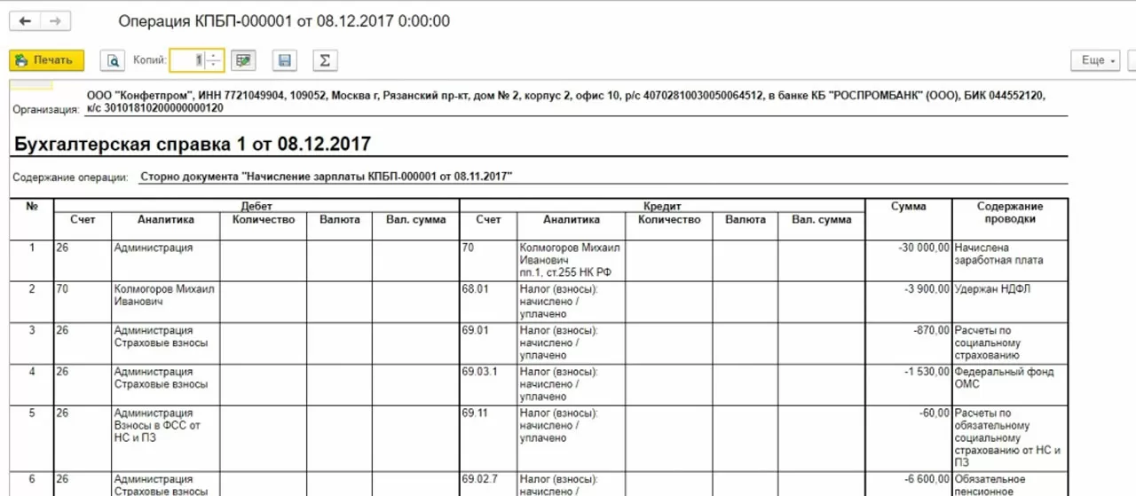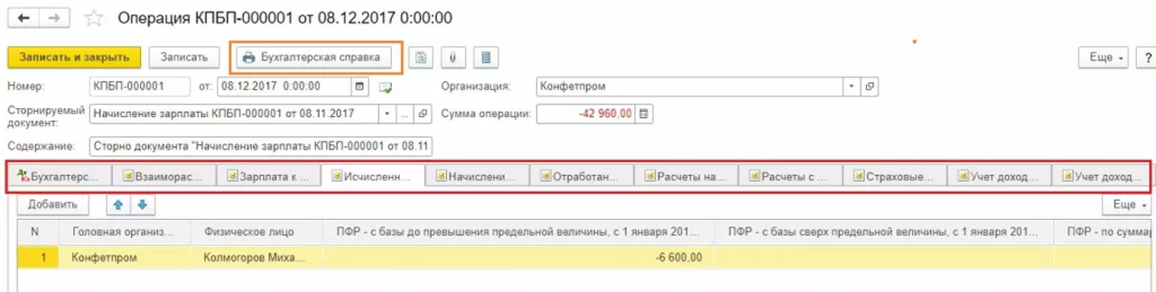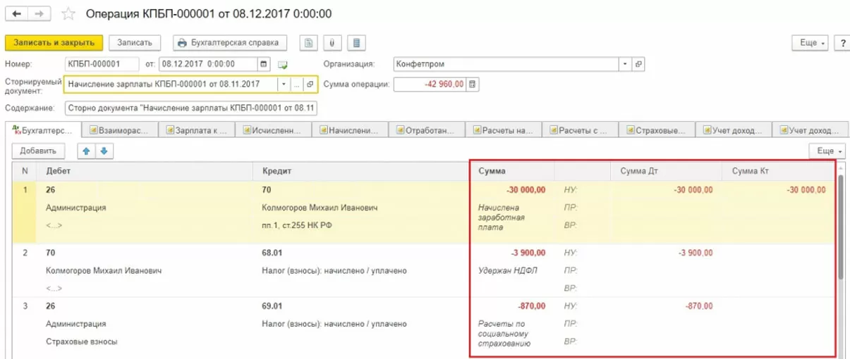 Пример 2: сотруднику в ноябре 2017 г. начислили отпускные в сумме 30 000, а должны были указать сумму 25 000. Операция сторно в 1С 8.3 будет декабрем 2017 года.
