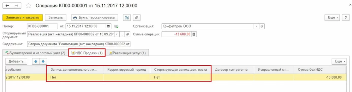 Для документов из раздела Реализация сторно в 1С выполняется согласно вышеуказанному алгоритму. Сторнирование реализации прошлого периода проводки по бухгалтерскому учету сформирует автоматически и правильно, а вот сторнирование НДС в налоговом учете потребует выполнить дополнительные настройки.