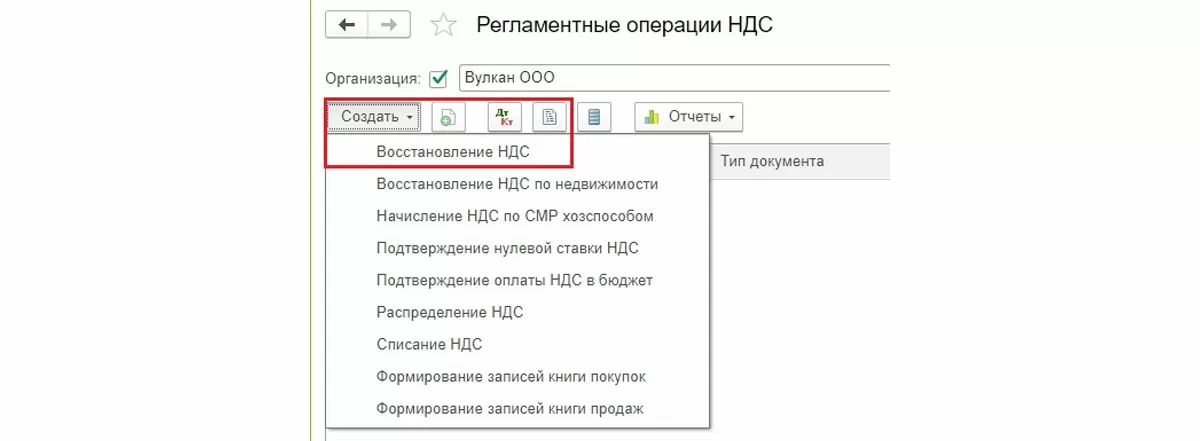 Затем Создать => Восстановление НДС