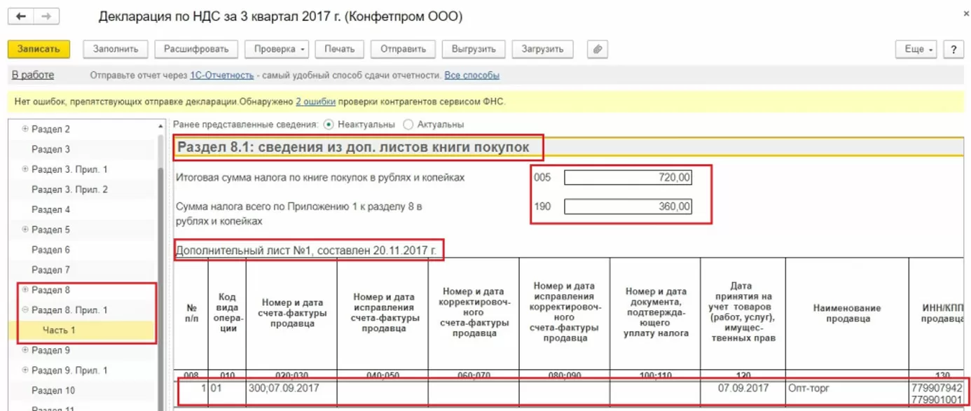 Далее можем переформировать отчет по книге покупок и декларацию, как показано выше.