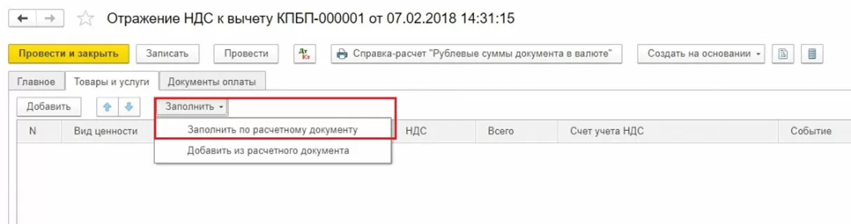 На вкладке Товары и услуги по кнопке Заполнить выбираем вариант Заполнить по расчетному документу.