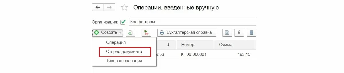 Кнопка Создать выдает список допустимых действий, выбираем Сторно документа.