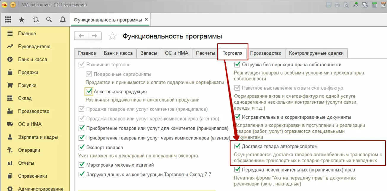 В открывшемся окне настроек находим закладку «Функциональность» и устанавливаем необходимую опцию «Доставка автотранспортом»: