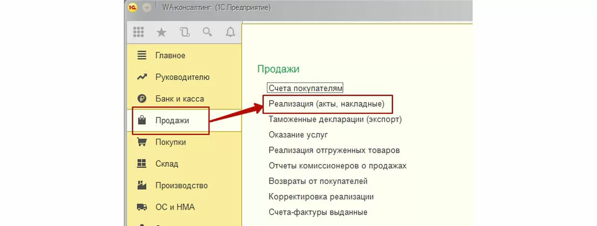 Как и все печатные формы, ТТН в 1С доступна из первичных электронных документов, регистрирующих хозяйственные операции. Товарная накладная в 1С формируется из документов реализации, доступ к которым возможен через интерфейс «Продажи»: