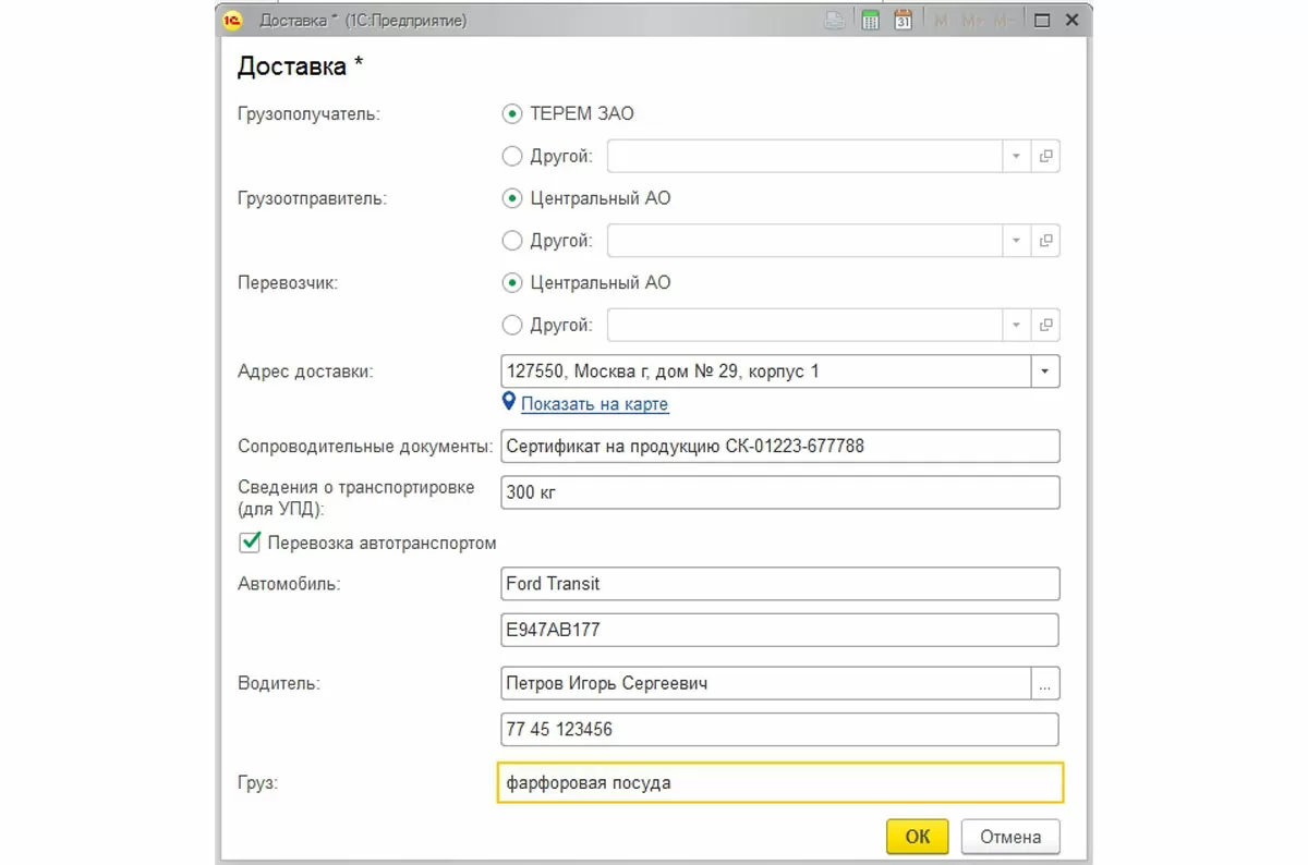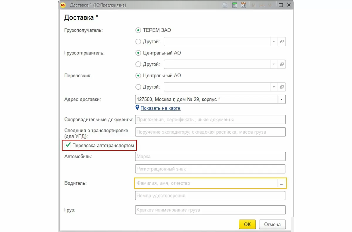Функционал системы для автоматизации бухгалтерского и налогового учета позволяет выбрать в качестве грузополучателя, грузоотправителя или перевозчика контрагентов, а также партнеров, которые непосредственно не участвуют в сделке купли-продажи, а связаны только с транспортировкой товаров. Для того чтобы выписка накладных в 1С была полной, предусмотрена опция «Перевозка автотранспортом». Ее установка даст возможность заполнить марку и регистрационный номер автомобиля, ФИО и номер удостоверения водителя, а также краткое наименование груза.