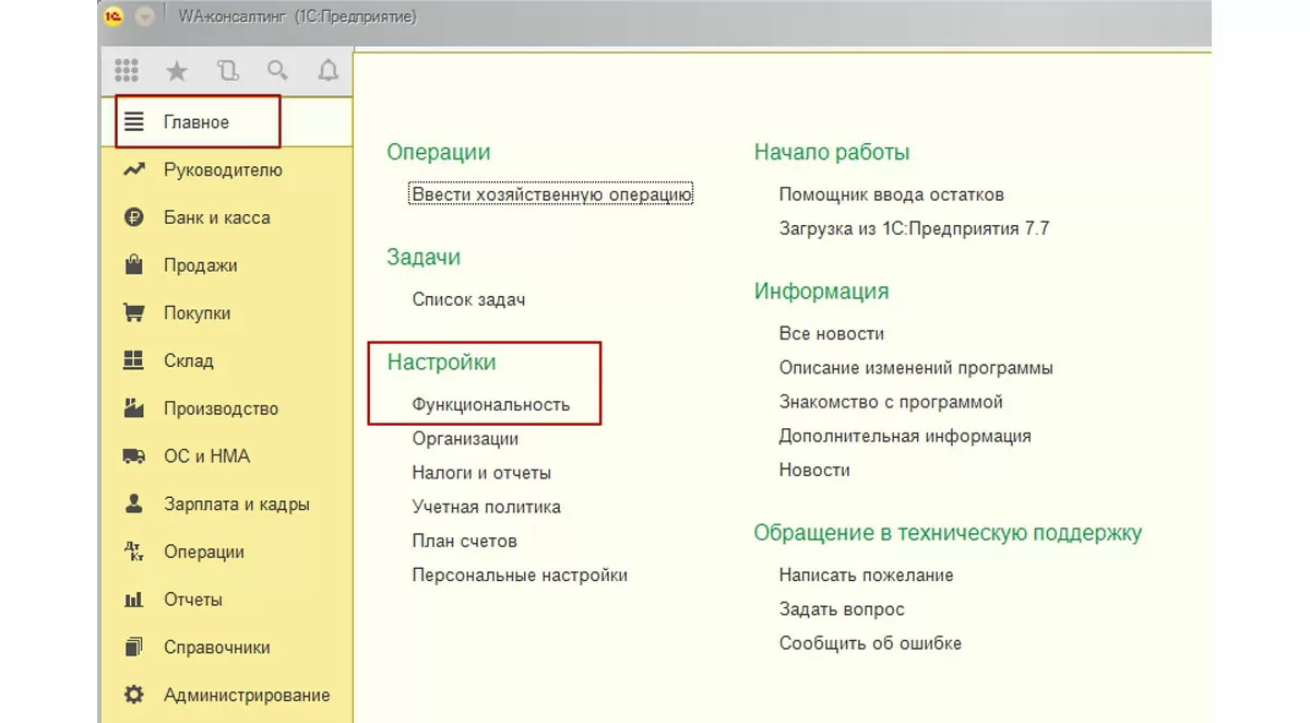 Чаще всего функционал, являющийся отраслевым или специализированным, становится доступен после включения дополнительных настроек или параметров. Транспортная накладная в 1С не является исключением, поскольку связана с торговой функциональностью системы, но далеко не каждому предприятию может потребоваться такая возможность. Таким образом, чтобы заполнить ТТН в 1С, необходимо включить опцию «Доставка автотранспортом». Эта опция доступна через меню раздела – Главное, подраздел – Настройки, пункт – Функциональность:
