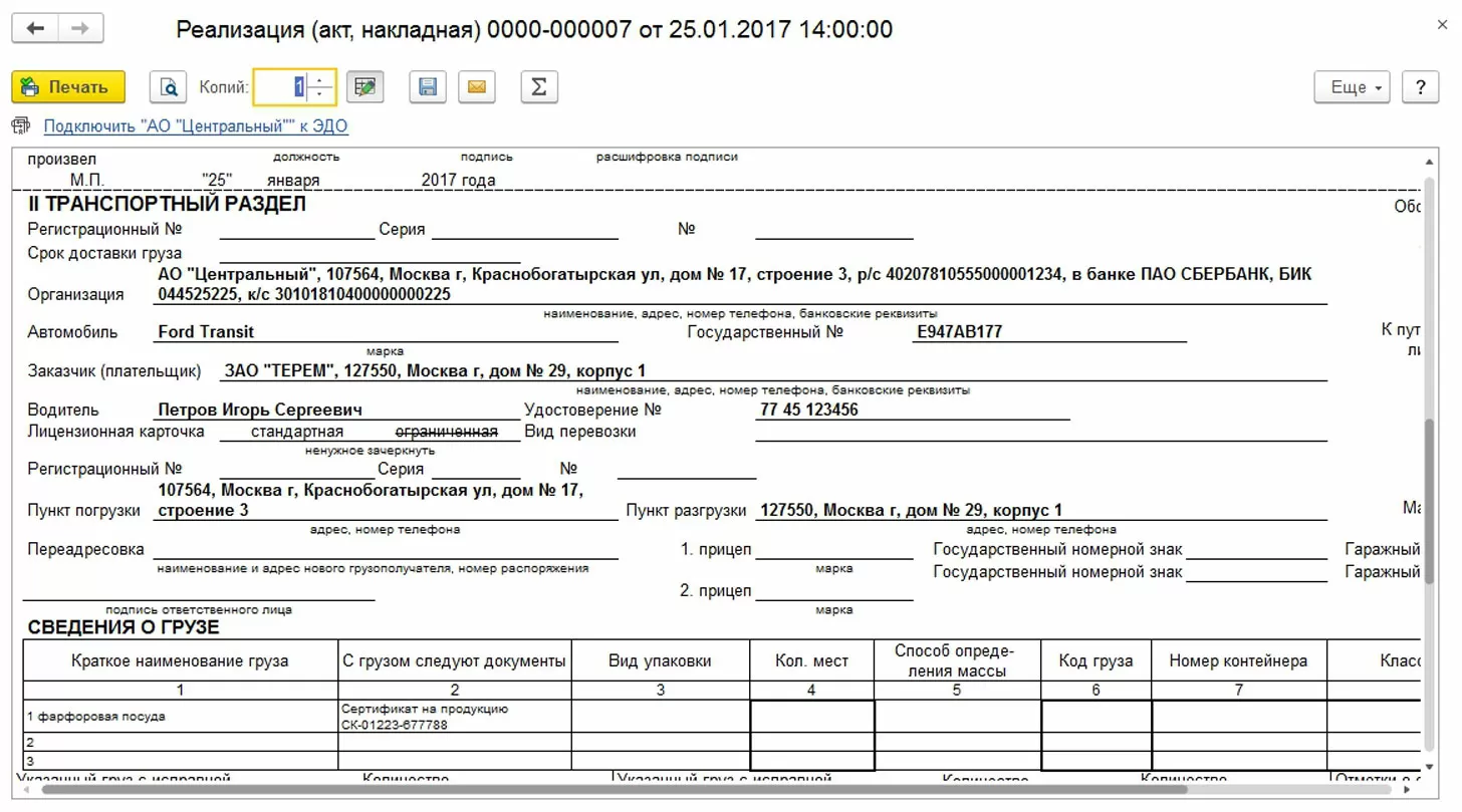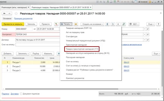 В результате мы имеем ТТН в 1С и можем напечатать товарную накладную.