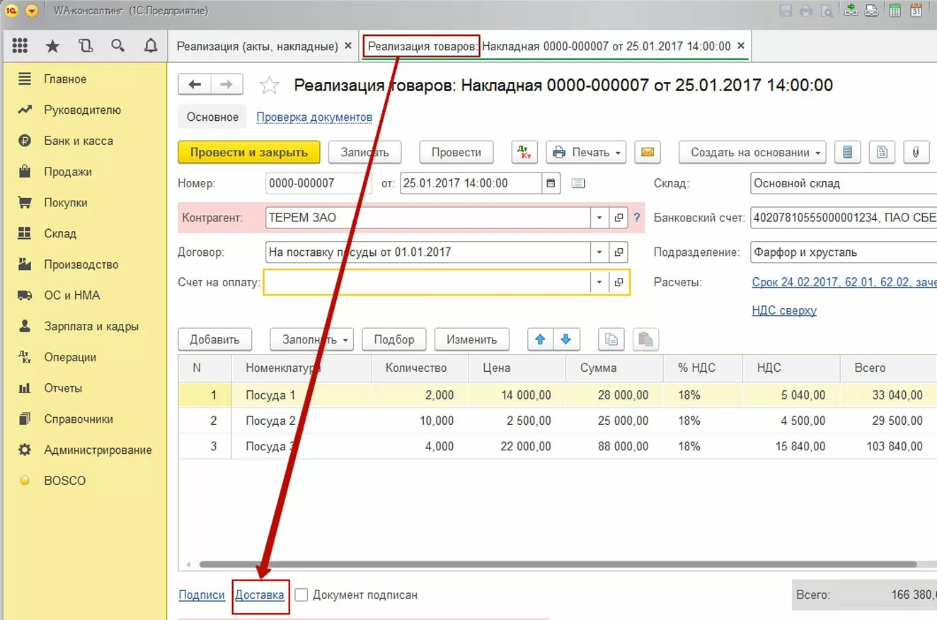 Для того чтобы напечатать товарную накладную, обязательно сначала заполнить ТТН в 1С. Все необходимые для печатной формы реквизиты не хранятся в системе. Их регистрируют непосредственно в первичном документе реализации. Для этого используется гиперссылка «Доставка», которая доступна в каждом документе реализации: