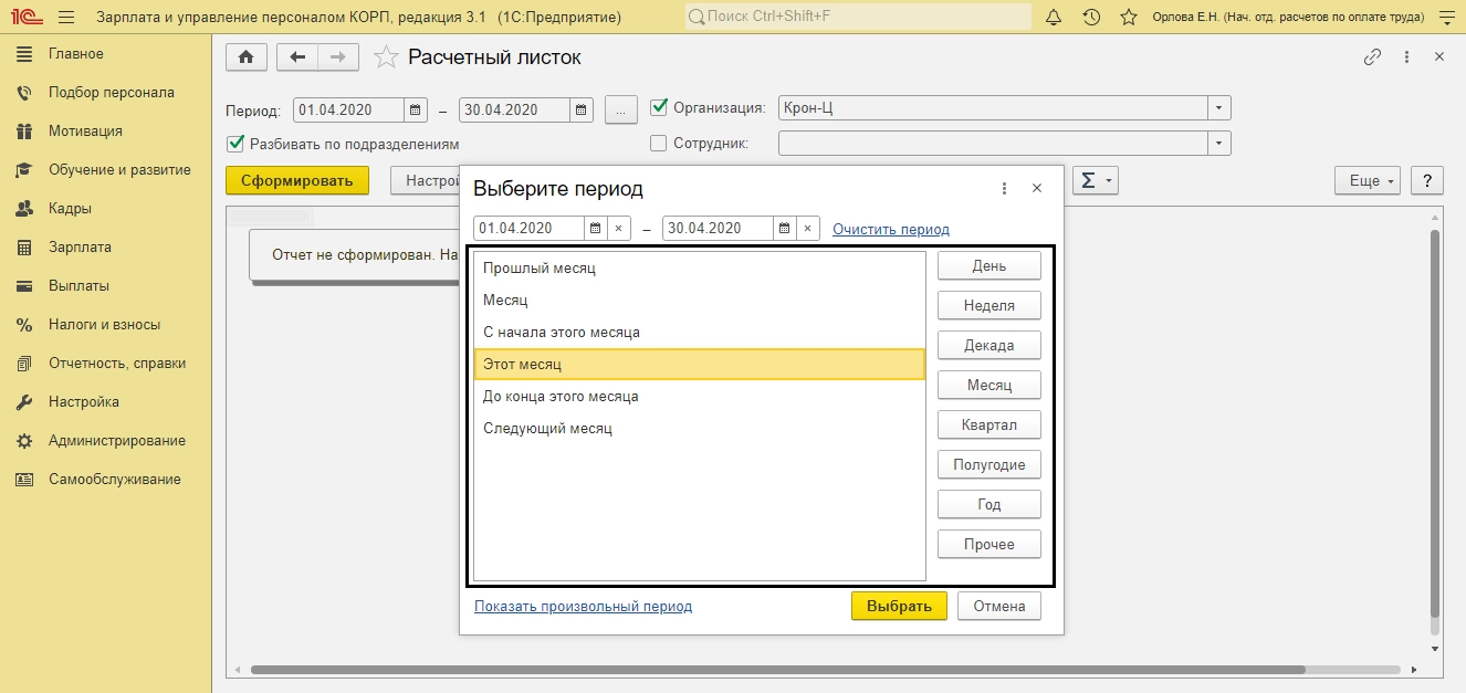 В стандартных периодах отчета «Расчетный листок», как и во всех других отчетах 1С доступны периоды: год, квартал, прошлый месяц, месяц, этот месяц, следующий месяц и т.д.