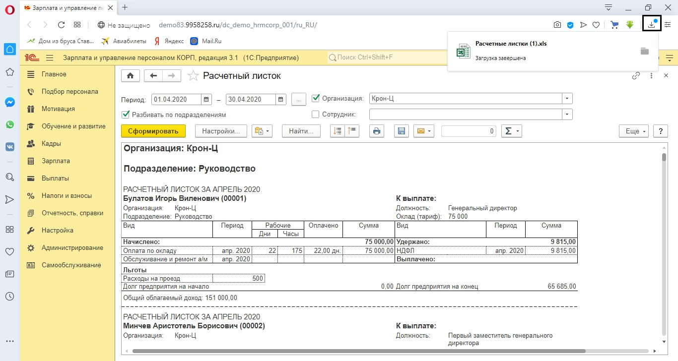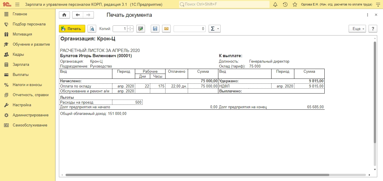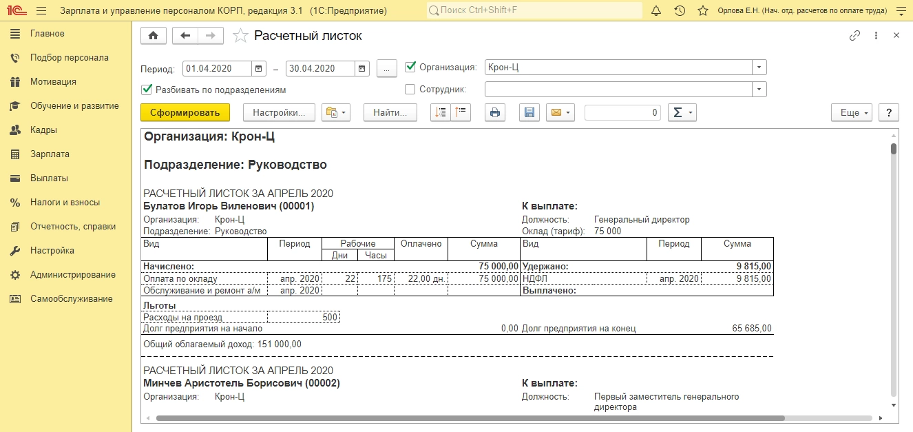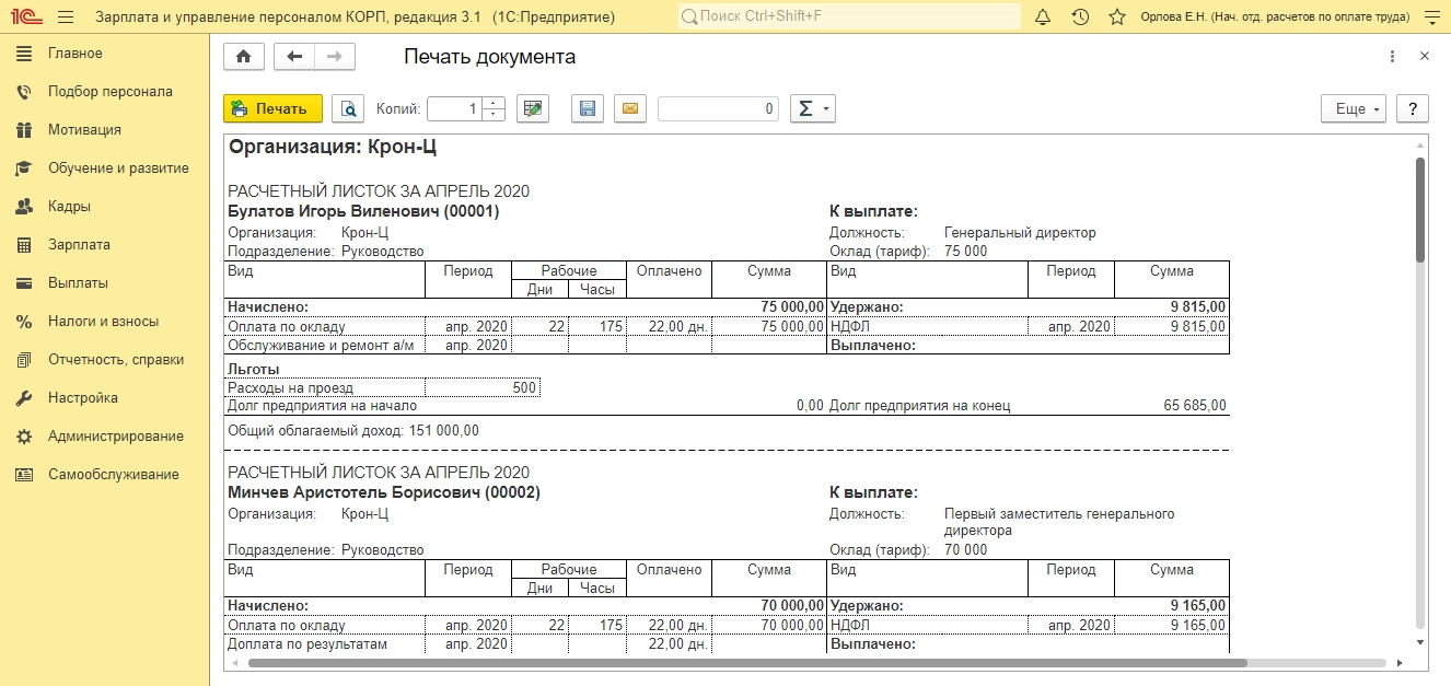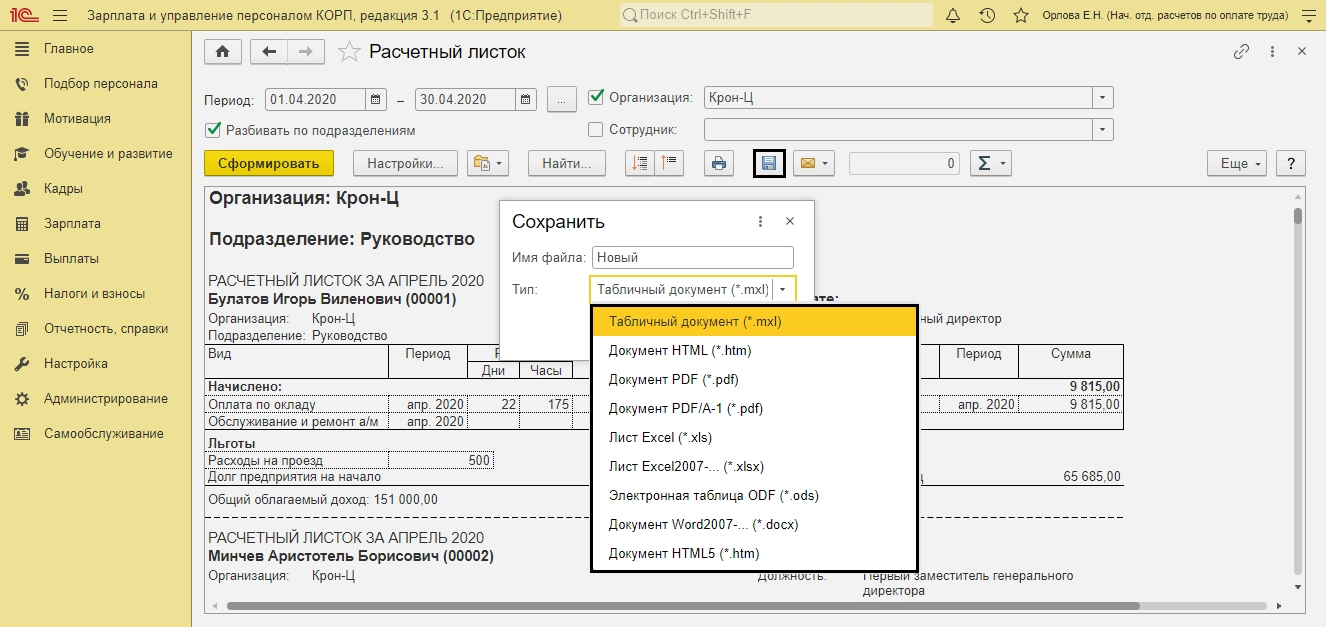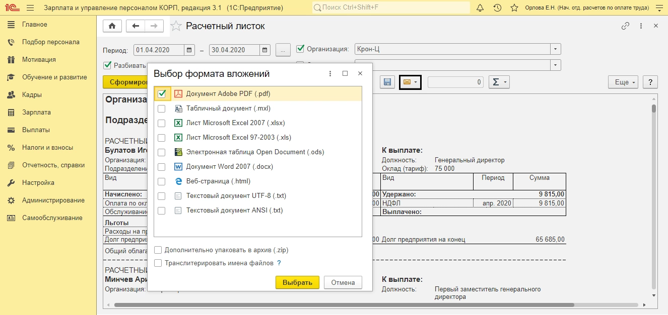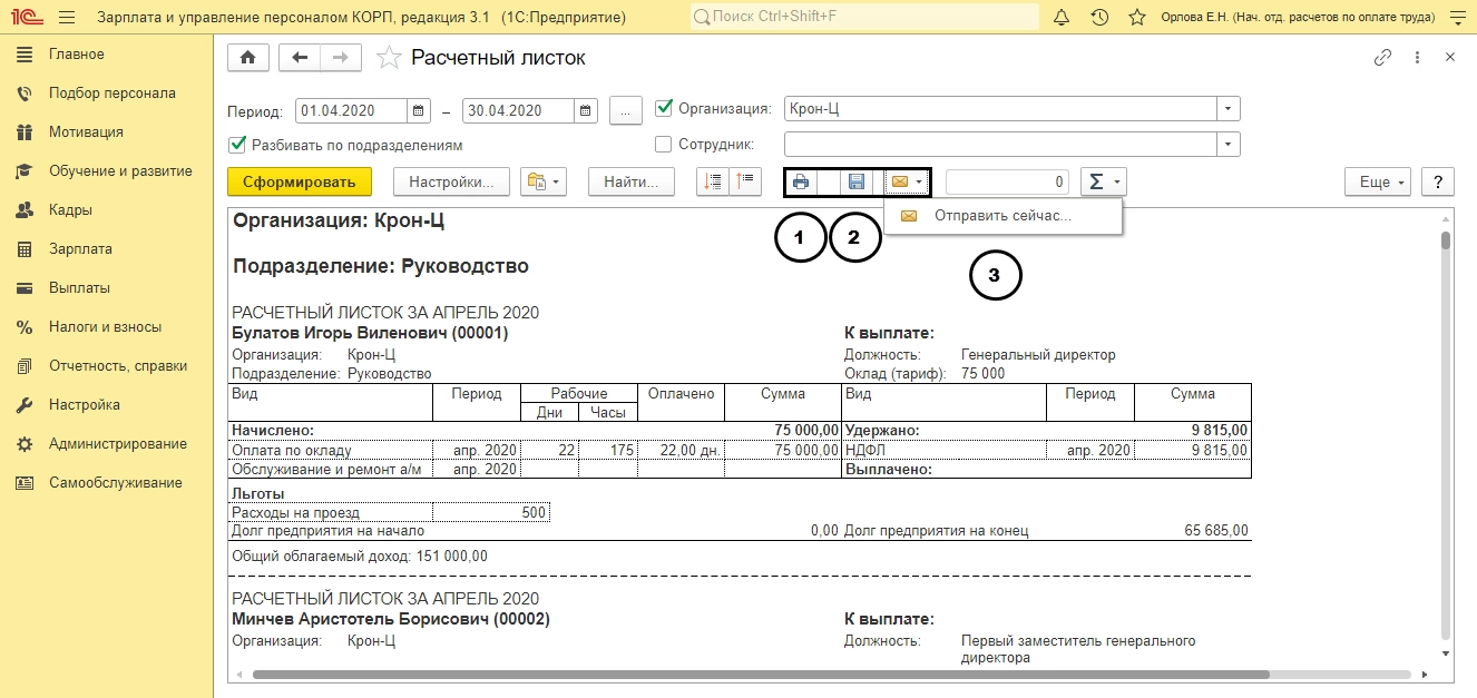 После того, как отчет сформирован, в программе 1С:ЗУП 3.1 расчетные листки по сотрудникам можно распечатать, отправить по электронной почте, сохранить в файл.