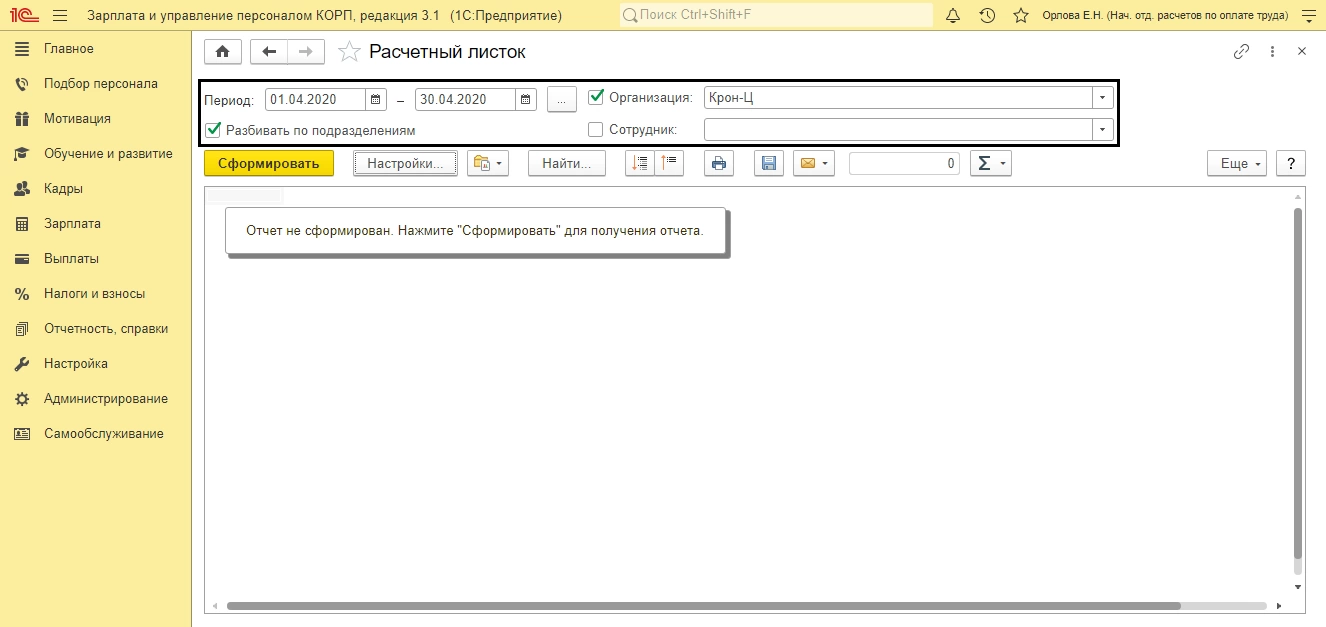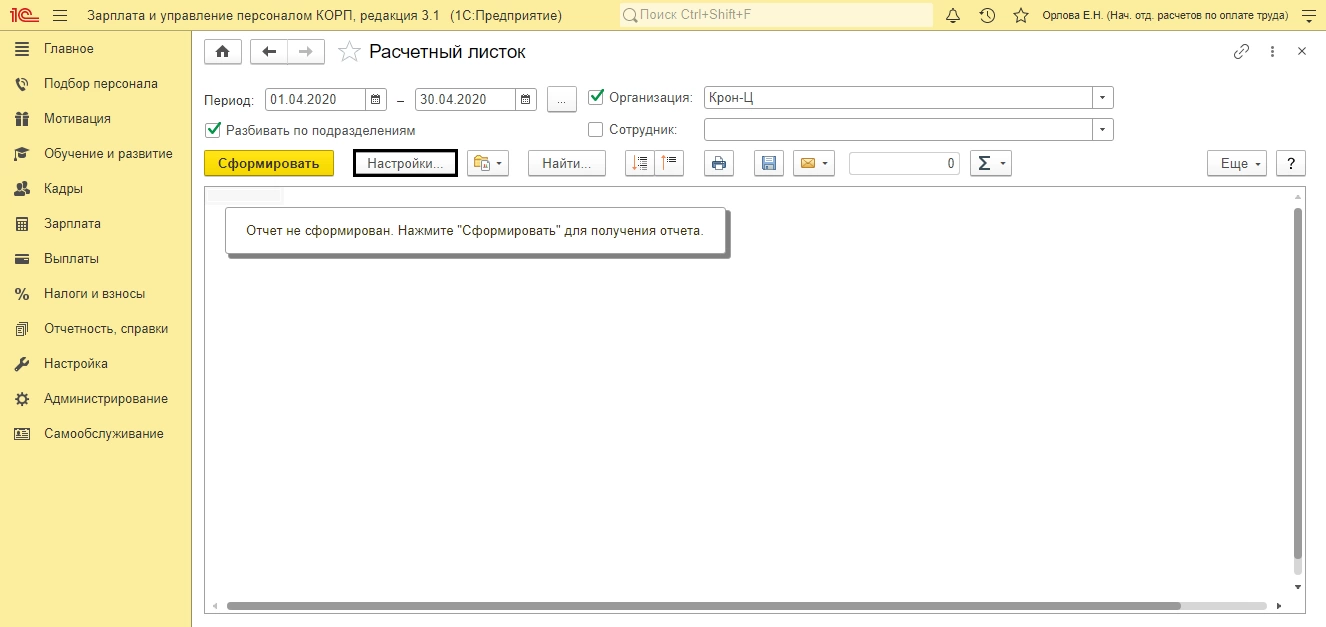 Откроется отчет «Расчетный листок». В данном отчете можно более детально установить настройки – выбрать период, сделать отбор по организации, подразделению, сотрудникам.