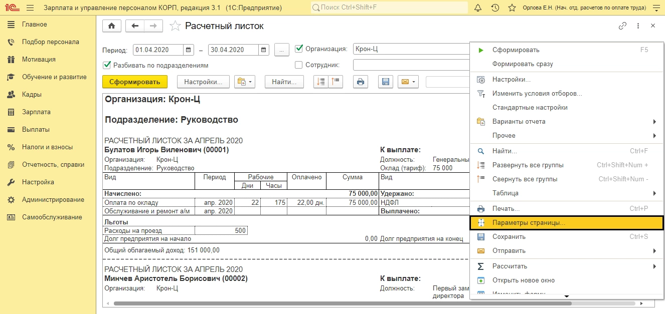 Нажатием кнопки «Печать» расчетные листки выведутся на принтер. В кнопке «Еще» можно сформировать предварительный просмотр документа перед печатью и при необходимости настроить параметры страницы.