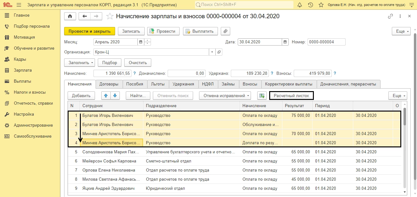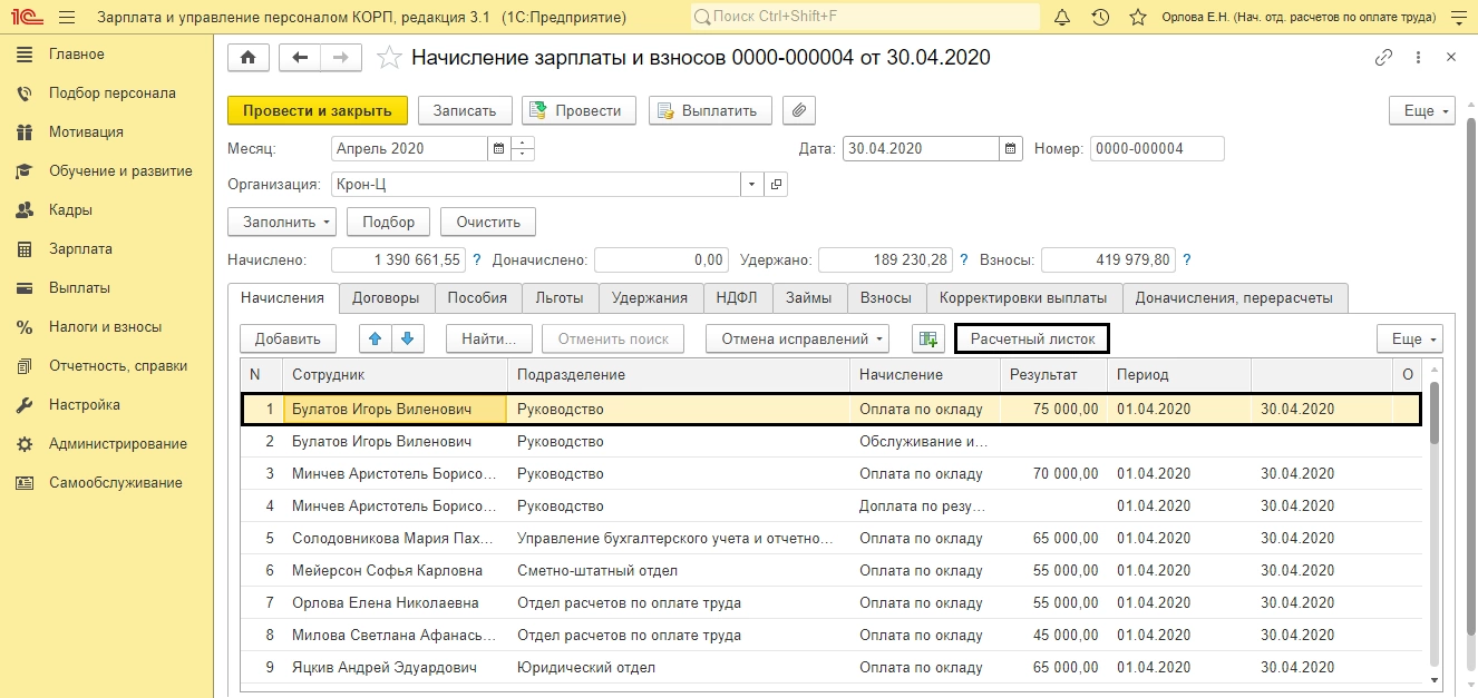 Мы рассмотрели, где в ЗУП 3.1 расчетные листки. Какие действия можно выполнить с ними рассмотрим далее.