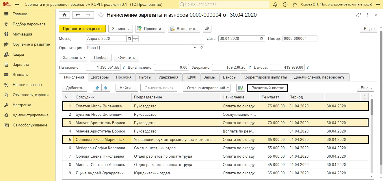 Кнопка Ctrl. Удерживая кнопку Ctrl, укажите сотрудников выборочно, по которым хотите сформировать расчетные листки. Нажав кнопку «Расчетные листки», они сформируются по выделенным сотрудникам.