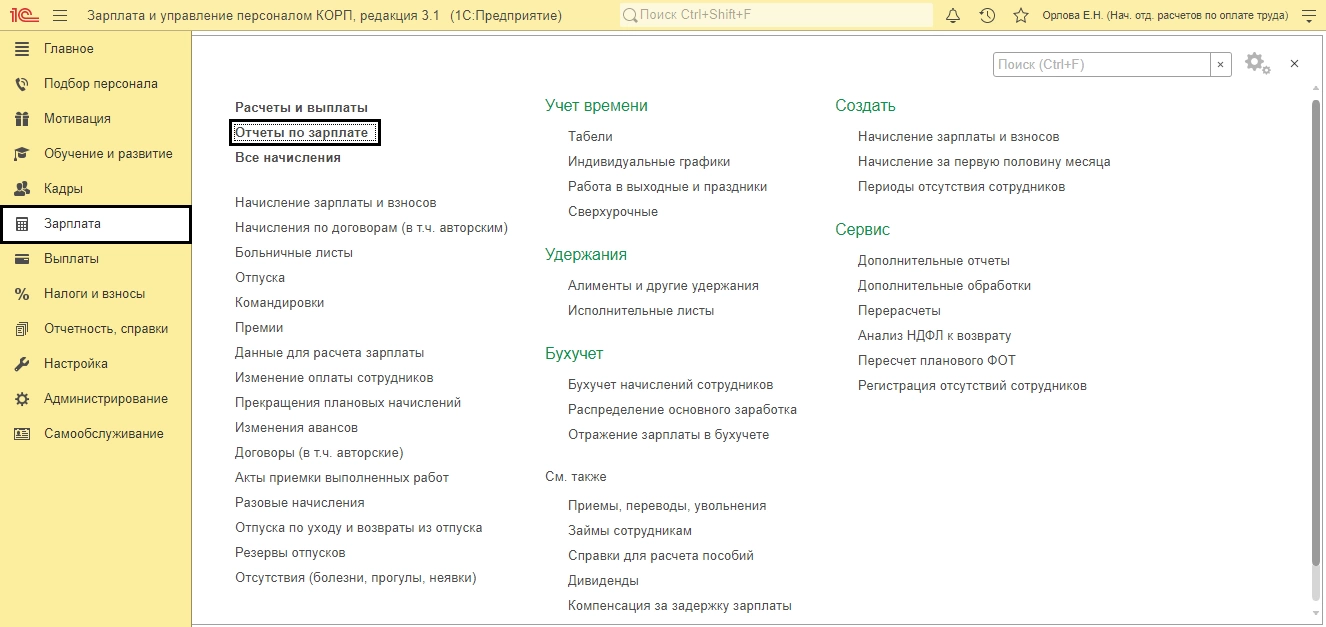 Рассмотрим еще один способ, как в ЗУП сформировать расчетный листок, для чего в меню «Зарплата» перейдем в раздел «Отчеты по зарплате».
