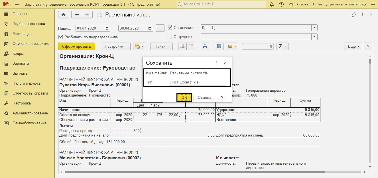 После того как имя файла задано и формат указан нажмите кнопку «Ок» и расчетные листки сохранятся.