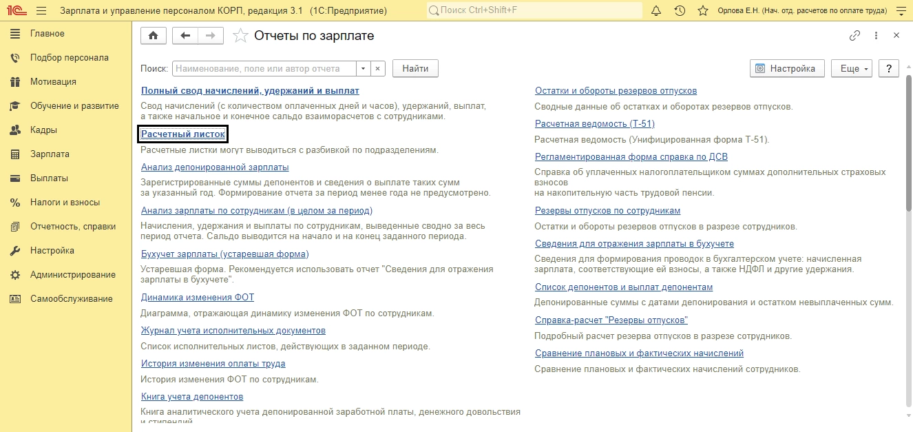 В общем списке отчетов найдите пункт «Расчетный листок».