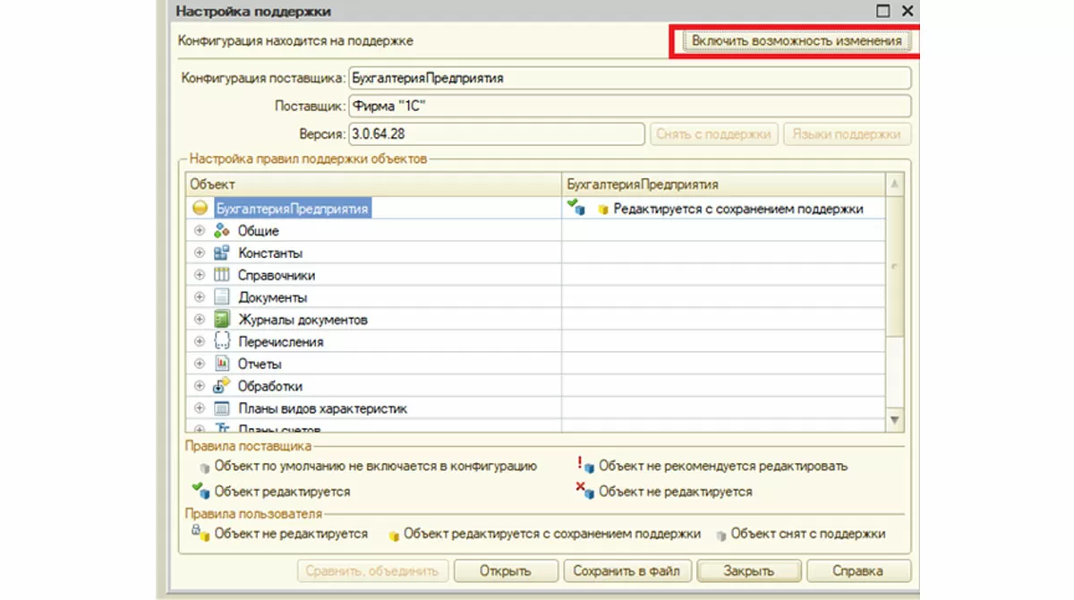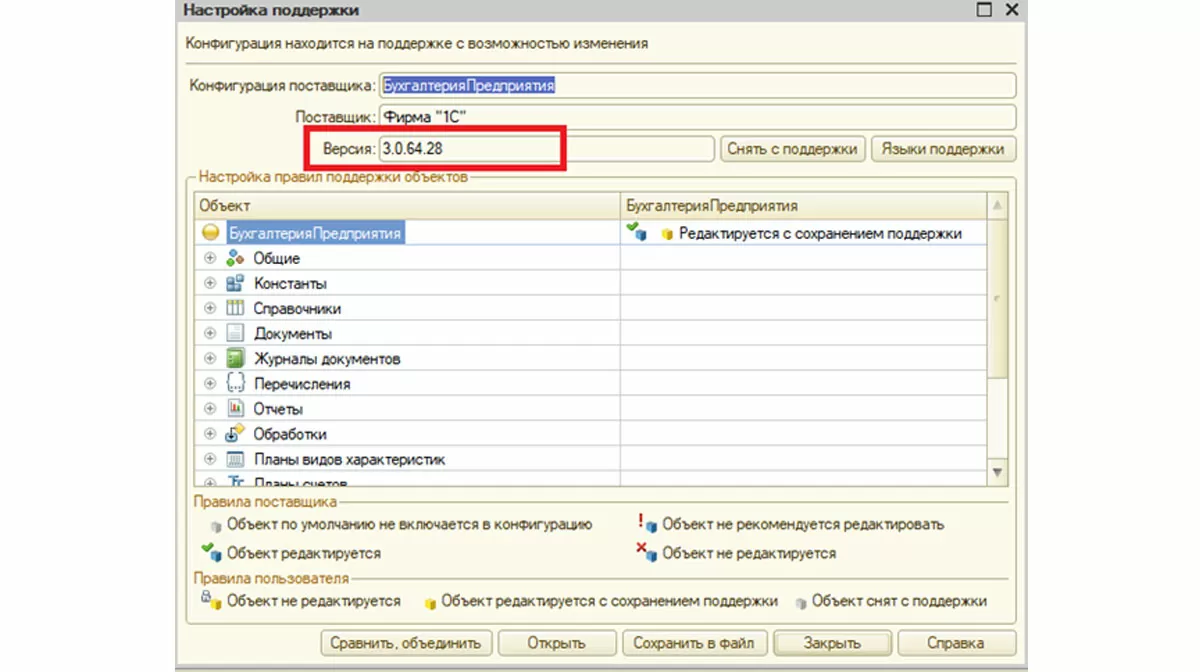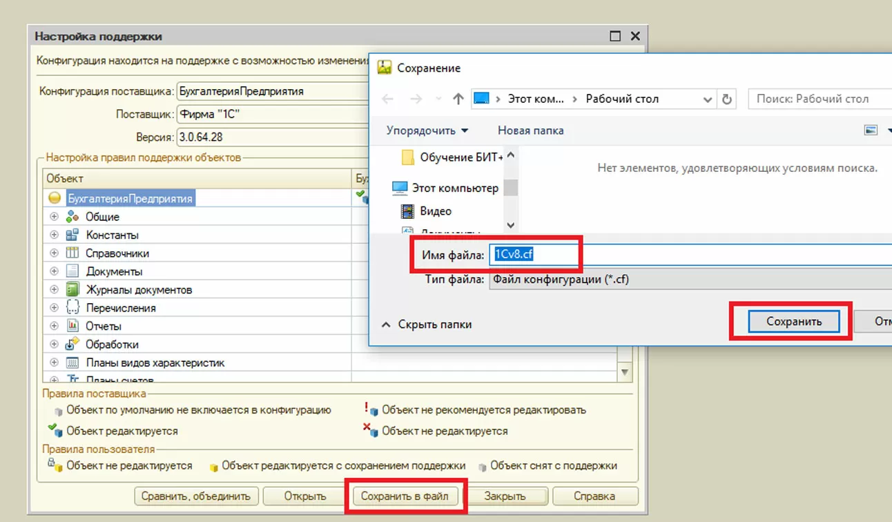 Если основная версия (снятая с поддержки) совпадает с вариантом поставщика, в окне настройки поддержки выгрузим конфигурацию: жмем «Сохранить в файл» и укажем путь сохранения. Версия поставщика сохранена.