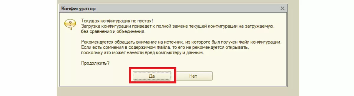 Если наша программа уже скорректирована в части структуры данных, но снова возникла необходимость поддержки, использование описанного ниже способа безвозвратно уничтожит внесенные правки. Только специалист, дающий профессиональные консультации по программам 1С, может правильно оценить риски этого действия.