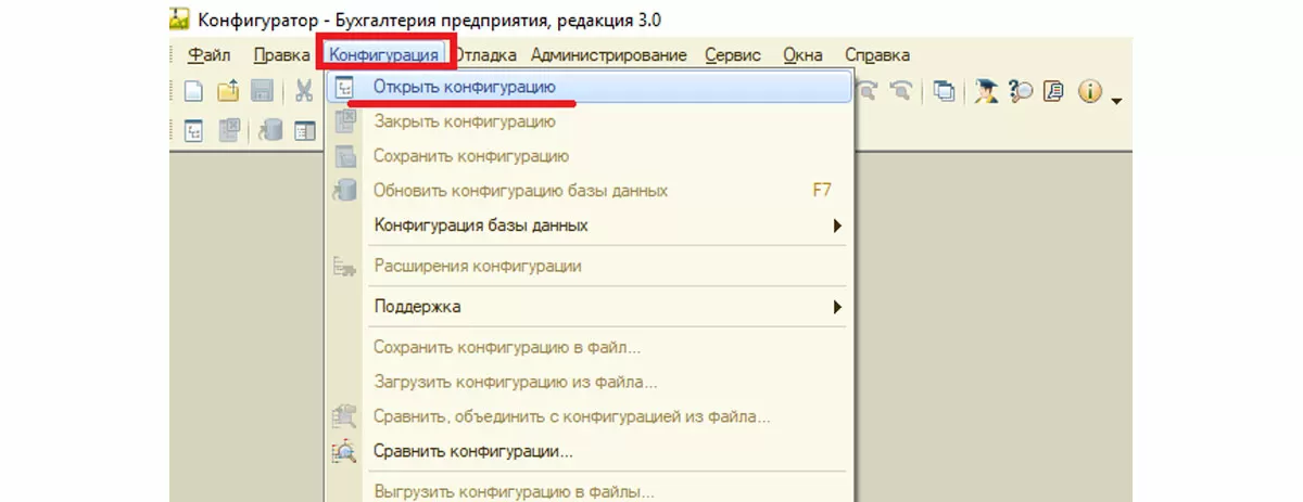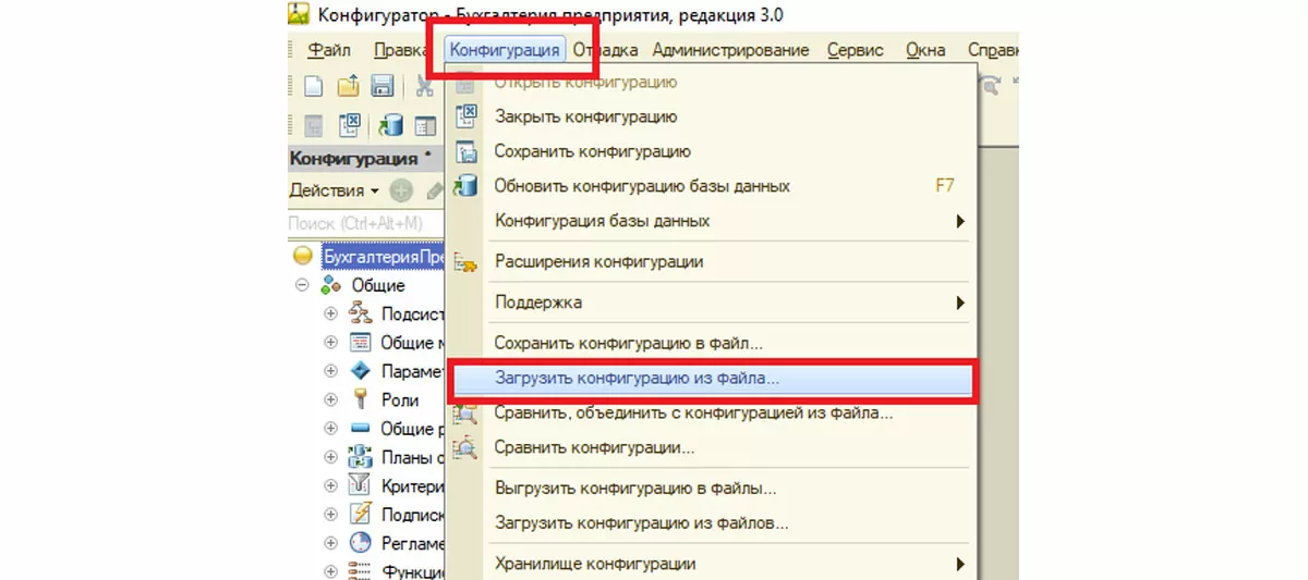 В главном меню открываем раздел «Конфигурация-Загрузить конфигурацию из файла».