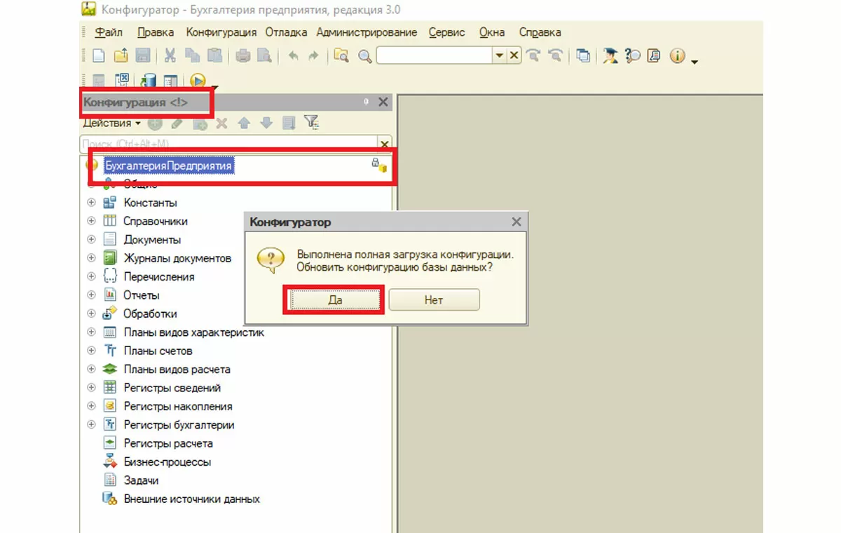 Обновляем версию информационной базы, о чем появляется сообщение системы. Нажимаем «Да».