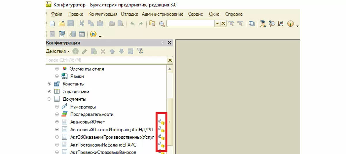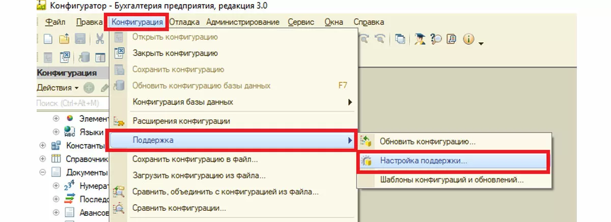 Конфигурация поставлена на поддержку, о чем нам говорит значок в ее наименовании.