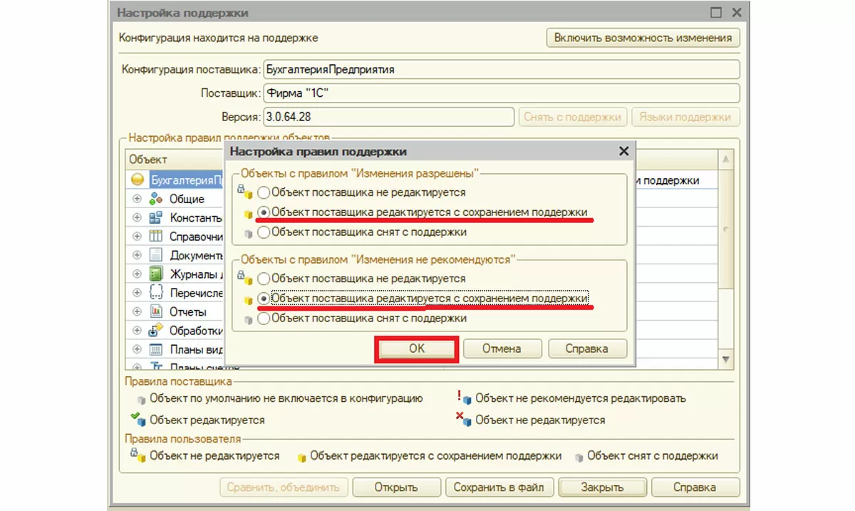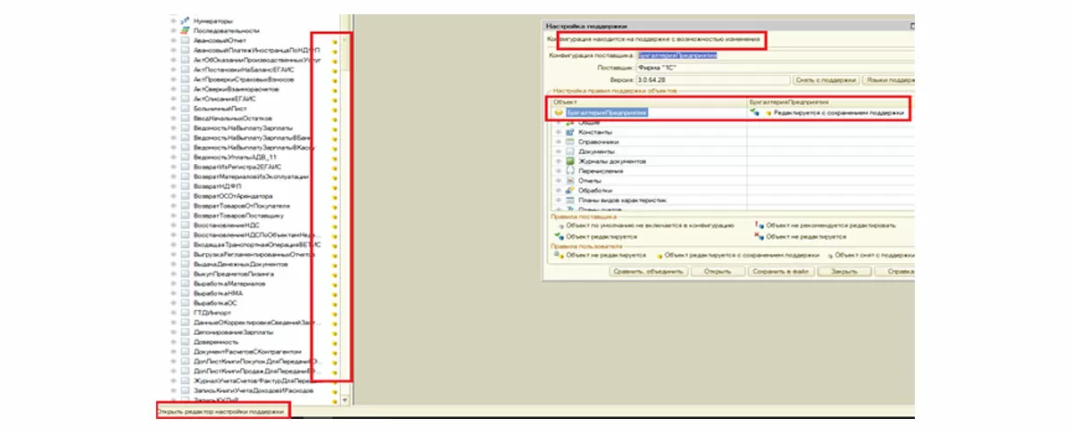 На этом этапе может появиться сообщение о блокировке объектов. В этом случае надо снять конфигурацию с поддержки полностью: «Конфигурация-Поддержка-Настройка поддержки», после чего повторить загрузку конфигурации из файла.