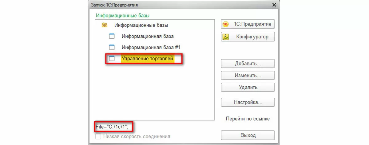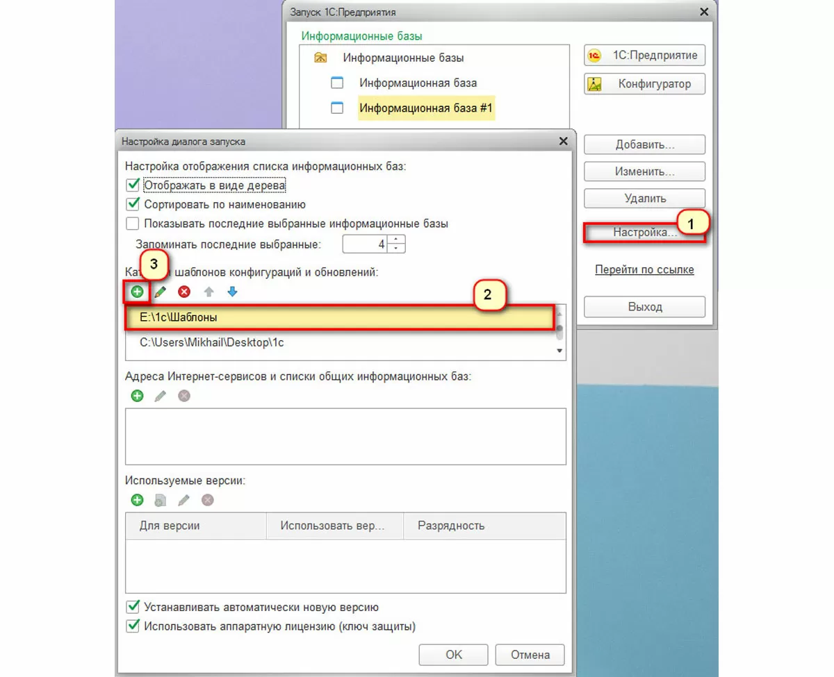 Если в списке информационных баз нажать «Настройка», в появившемся окне можно увидеть каталоги, из которых берутся шаблоны конфигураций для установки. Каталог создается автоматически при первой установке или его указывают вручную. Установленные шаблоны должны обязательно быть в одном из прописанных каталогов, иначе при создании новой базы они не будут доступны.