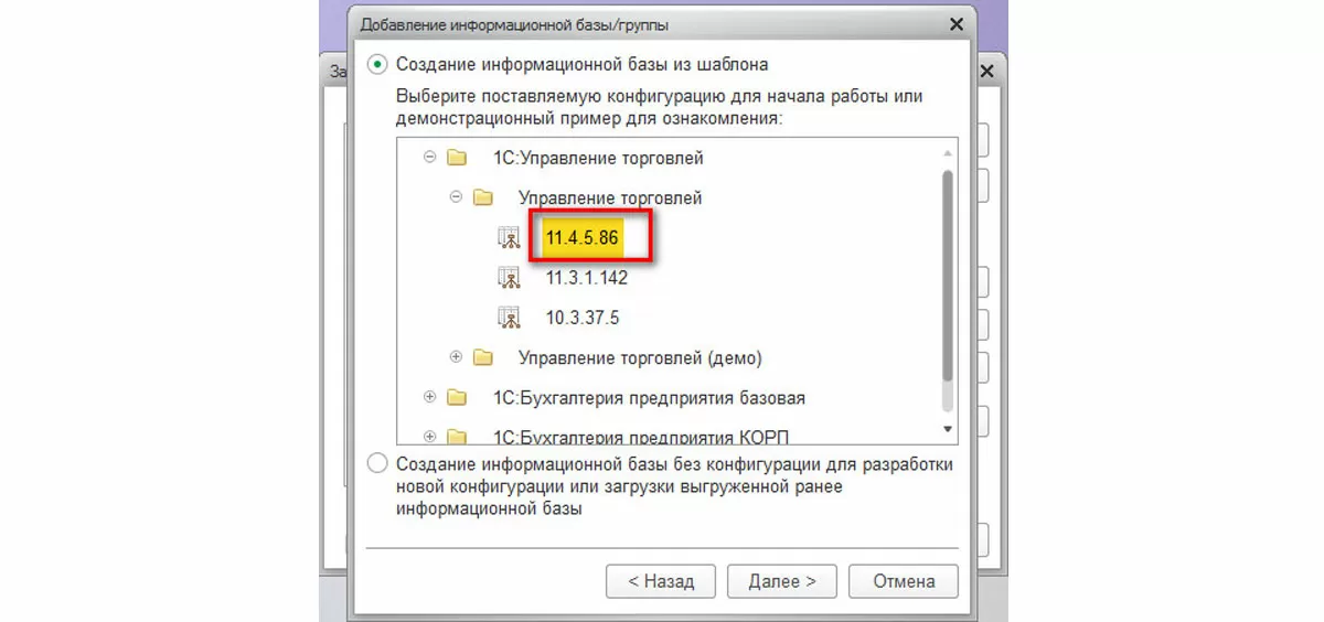 - Новая пустая база с какой-либо конфигурацией. Используется для ведения учета и работы в базе. Для ее создания понадобится установочный файл с необходимой конфигурацией.