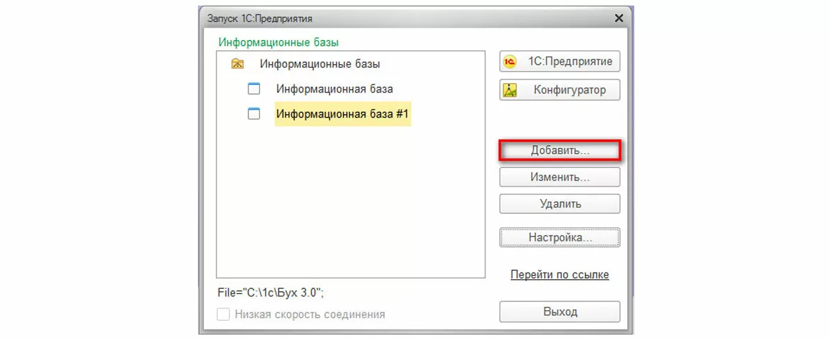 После окончания установки снова запускаем ярлычок 1С. Жмем кнопку «Добавить».