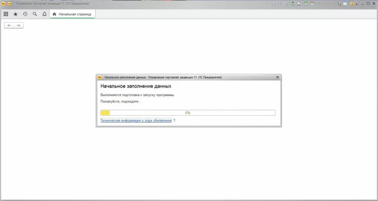 После этого надо запустить новую информационную базу в режиме предприятия. При первом запуске программа воспользуется имеющейся лицензией 1С или предложит получить ее при отсутствии. О получении лицензии будет рассказано в отдельной статье. Тогда же, при первом запуске, информационная база произведет начальное заполнение данных. Процесс может занять от 5 до 10 минут в зависимости от параметров системы и вида конфигурации.