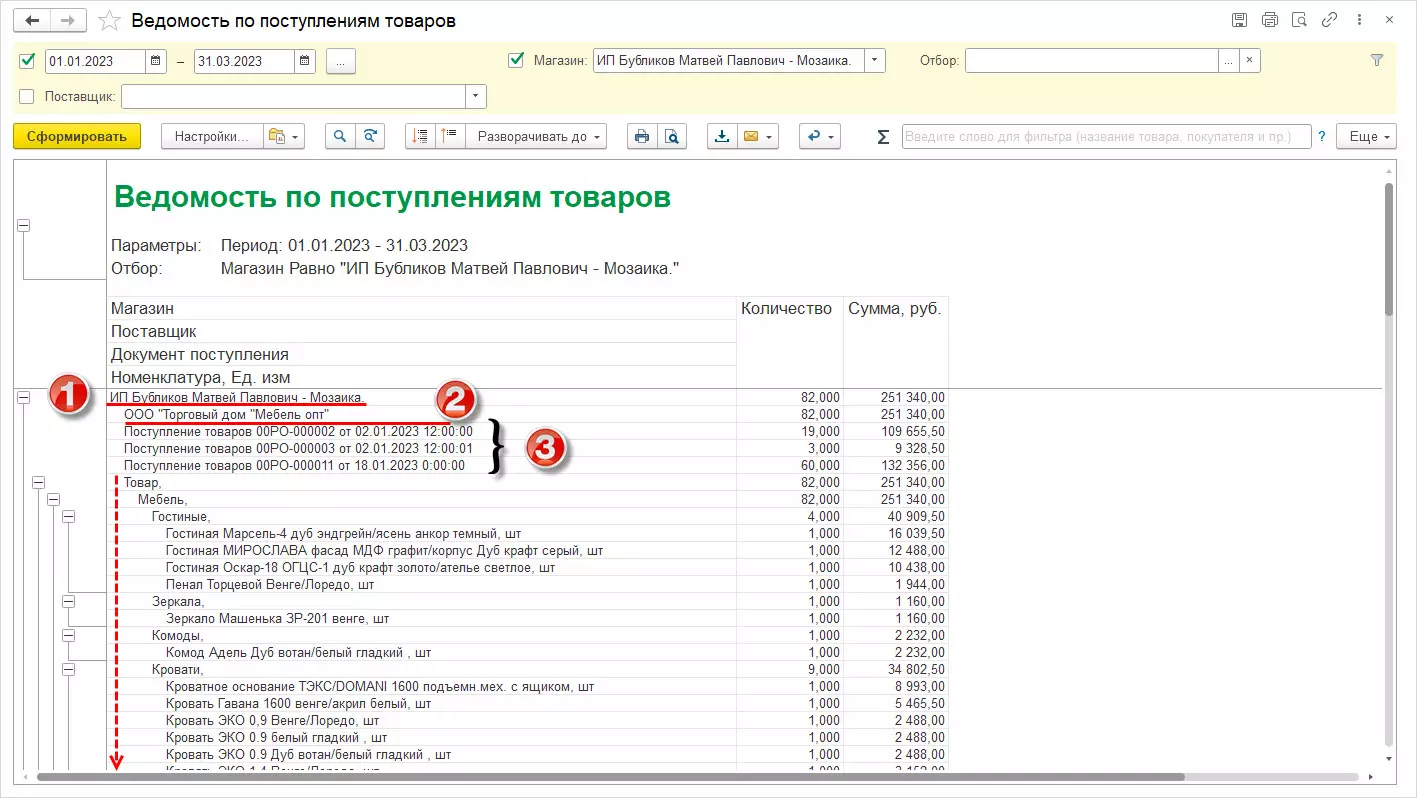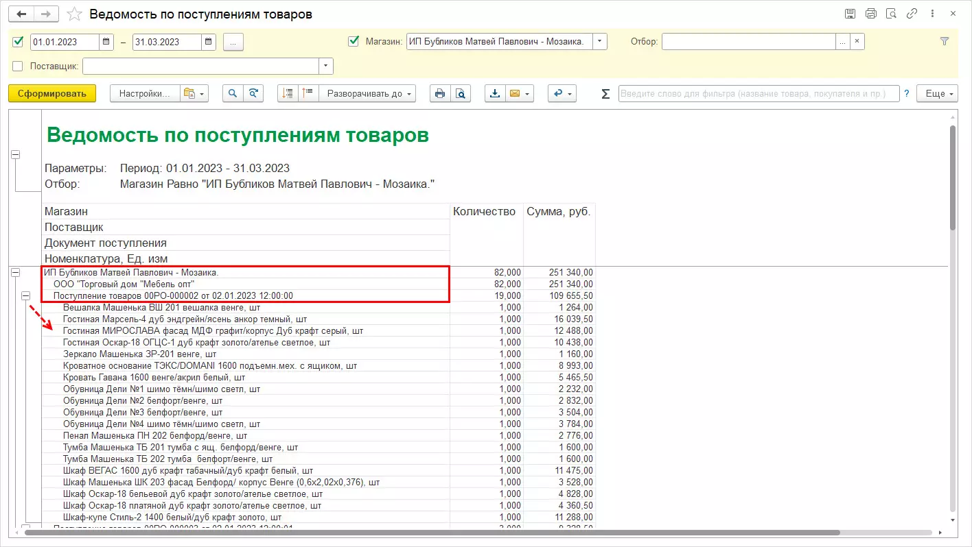 Во главе с Бубликовым М.П. – магазин «Мозаика», под наименованием магазина и поставщика, указан первый документ поступления, с перечисленными товарами в подчинении, затем второй и так далее. Т.е. номенклатура подчинена полю Документ поступления. И с отключенной иерархией отчет выглядит более компактно и аккуратно.