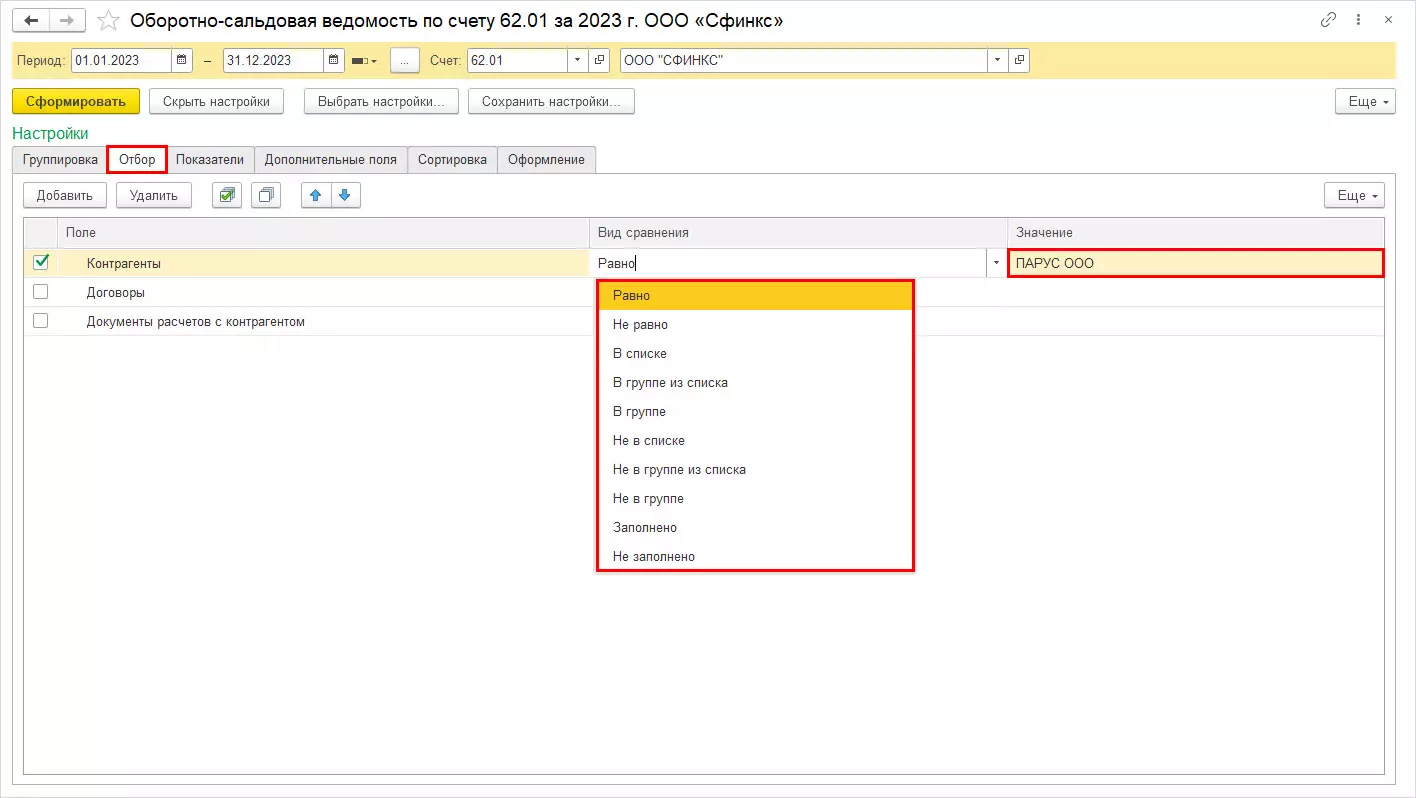Например, Контрагент равно ООО Парус. Пользователь может задать любое условие, выбрав из выпадающего списка.