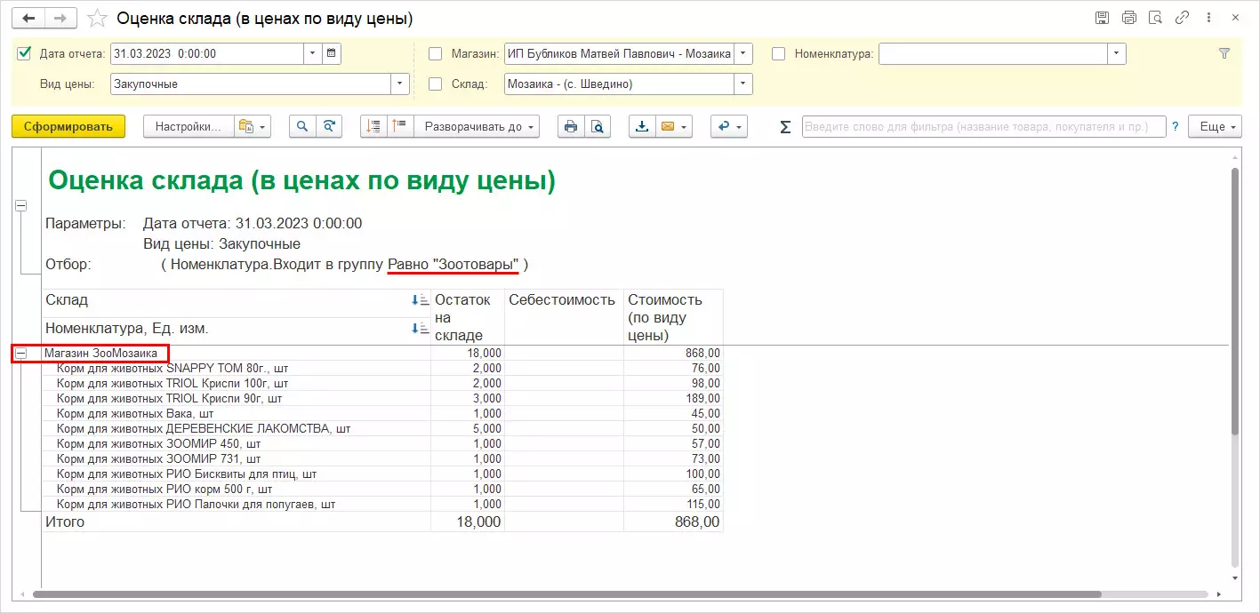 В отчете отразились остатки по группе Зоотовары в закупочных ценах. В результате настройки, в отчете появляется группировка по выбранному полю – в нашем примере по магазинам, которую можно свернуть и развернуть – знак «- +».