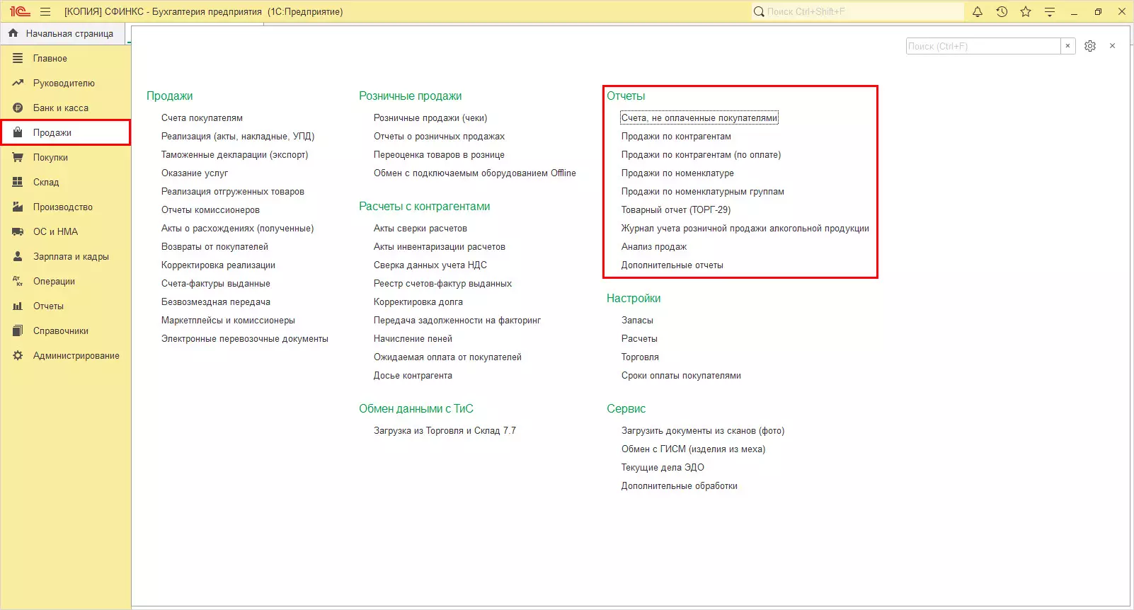 В разделе «Продажа» отчеты сгруппированы в подразделе «Отчеты», где также имеется пункт «Дополнительные отчеты» – это внешние отчеты, добавленные в 1С пользователем.