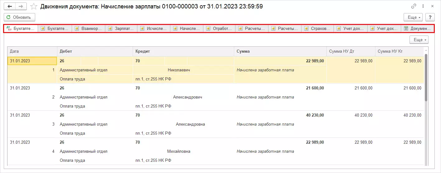 Из движений документа (см. Рис. 19) видно, что кроме бухгалтерских записей есть еще множество вкладок – это записи в задействованные регистры. На их основании формируются другие различные отчеты.