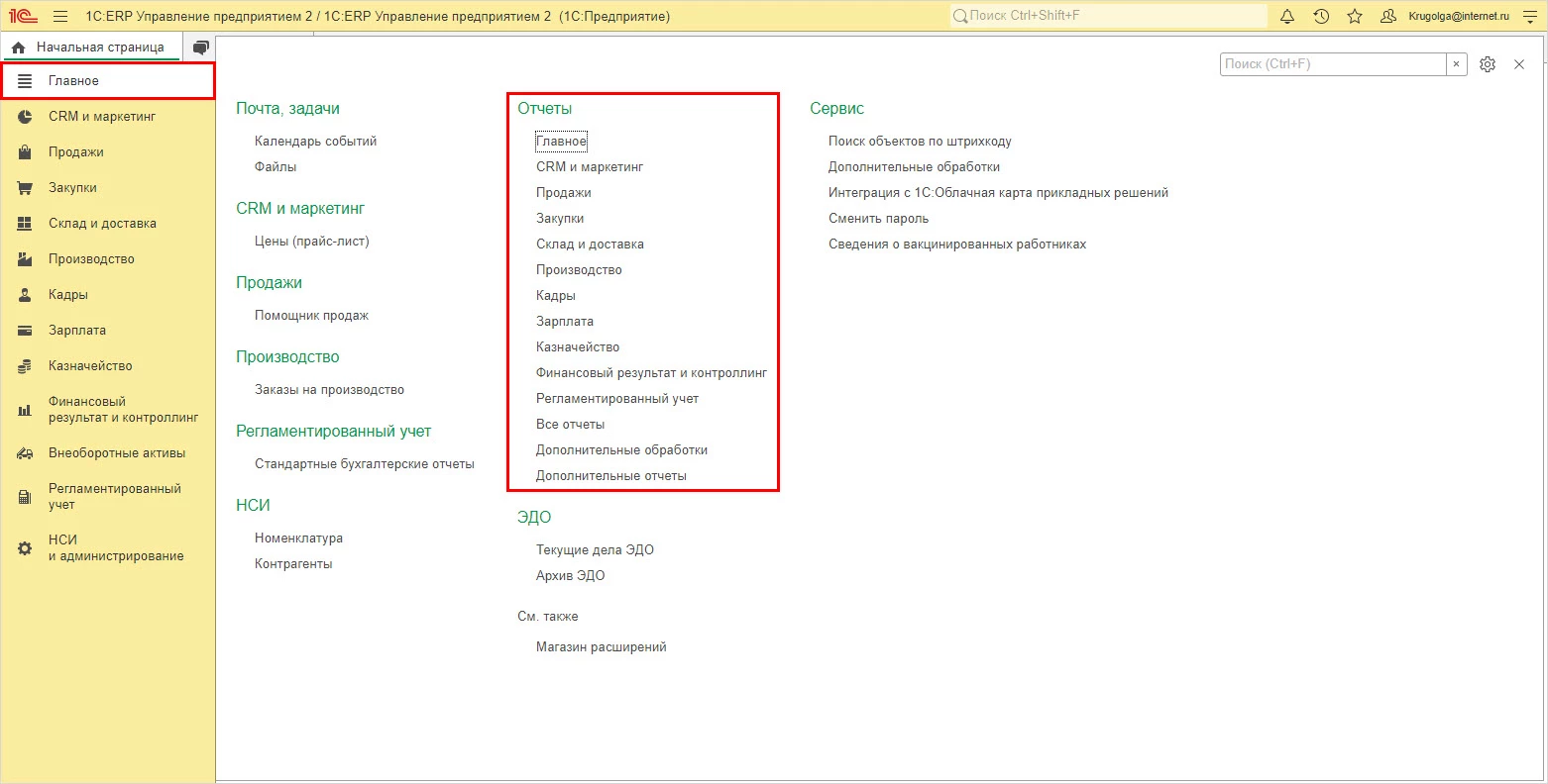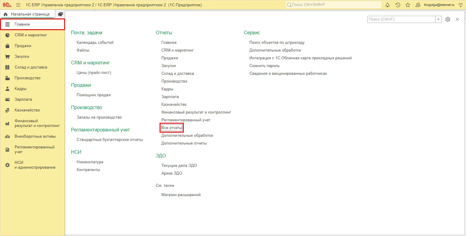Общий список отчетов по разделам также доступен из раздела «Главное» (пример 1С:ERP).